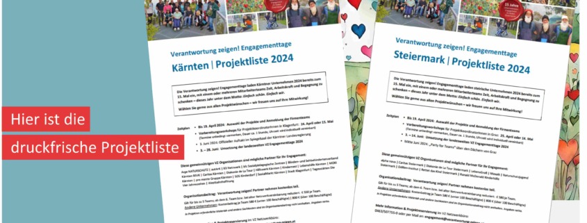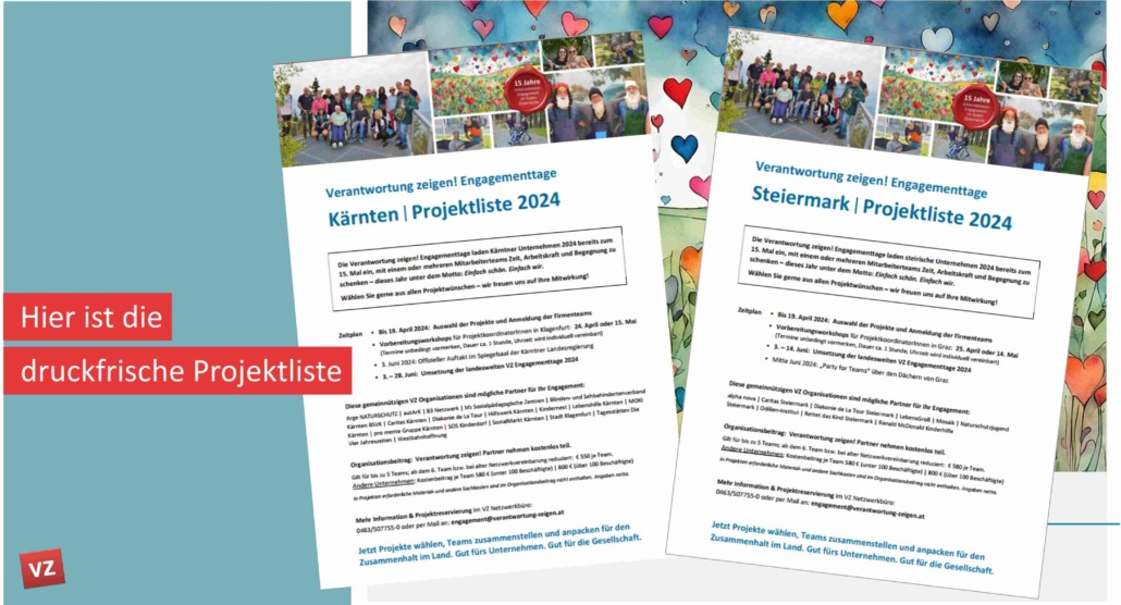 3. März 2024. Nach dem online-Auftakt zu den landesweiten Engagementtagen 2024 können sich Unternehmen ab sofort für die Mitwirkung anmelden und das passende Engagement wählen. Dazu gleich im Netzwerkbüro die druckfrische Projektliste mit den vielen Wünschen der gemeinnützigen Organisationen anfordern. Das heuer bereits zum 15. Mal stattfindende, traditionelle landesweite Corporate Volunteering Event geht heuer im Juni in Kärnten und in der Steiermark über die Bühne. Weil der Zusammenhalt von Wirtschaft und Gesellschaft zählt.