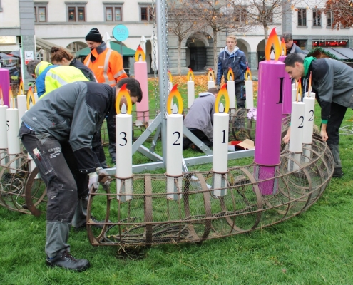 Für den Transport und den Aufbau sowie für die Beleuchtung des Stahl-Kranzes ist die Kelag zuständig. Sechs motivierte Lehrlinge schreiten diesmal zur Tat. Heuer musste der Kranz allerdings schon davor umfangreichen Restaurationsarbeiten unterzogen werden. Er wurde nämlich beschädigt, während er das restliche Jahr über im Lager war. „Die Kerzen waren abgebrochen. Es musste viel repariert werden“, erzählen Markus Pogoriutschnig und Martin Wegscheider, die als Ausbildner in der Lehrlingsschule tätig sind und beim Aufbau des Adventkranzes jedes Jahr tatkräftig anpacken. Die Schäden sieht man dem Kranz allerdings kaum an, denn die traditionellen 24 Kerzen strahlen nach wie vor in all ihrem Glanz. Ein paar Feinlackierungsarbeiten mussten noch vorgenommen werden, bevor es für die vier Gärtnereilehrlinge der Diakonie de La Tour ans Werk ging. Für diese heißt es kreativ werden! Die angelieferten Tannenzweige werden zusammengebunden und anschließend in den Stahl-Kranz gesteckt. Die gemeinsame Arbeit zieht sich bis in den Nachmittag, doch trotz niedrigen Temperaturen sind die Jugendlichen mit viel Motivation im Einsatz. Beim Advent-Opening am 2.12. kann der fertig geschmückte Kranz in seiner vollen Pracht bestaunt werden.
