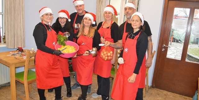 Sandra Napetschnig, Organisatorin der Arbeiterkammer Kärnten für dieses VZ! Projekt, begrüßt in der Küche in der das fleißige Team zu beschwingter Musik und mit auf die roten AK-Schürzen abgestimmten Weihnachtsmützen Frittaten schneidet, den Erdäpfelsalat vorbereitet und die Hühnersuppe verfeinert. „Kuchen haben die Mitarbeiter schon zuhause individuell vorbereitet. Da machen wir später  gemischte Kostproben“, erklärt sie und holt für die Panier 40 Eier aus dem Kühlschrank. Sie ist schon seit vielen Jahren bei den unterschiedlichen Projekten dabei und sieht dies schon als Selbstverständlichkeit an, gerade wenn es einem selbst gut geht.