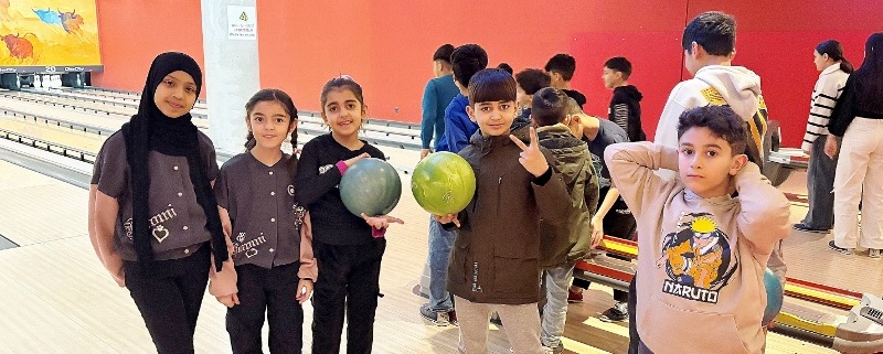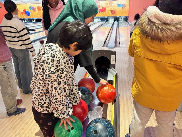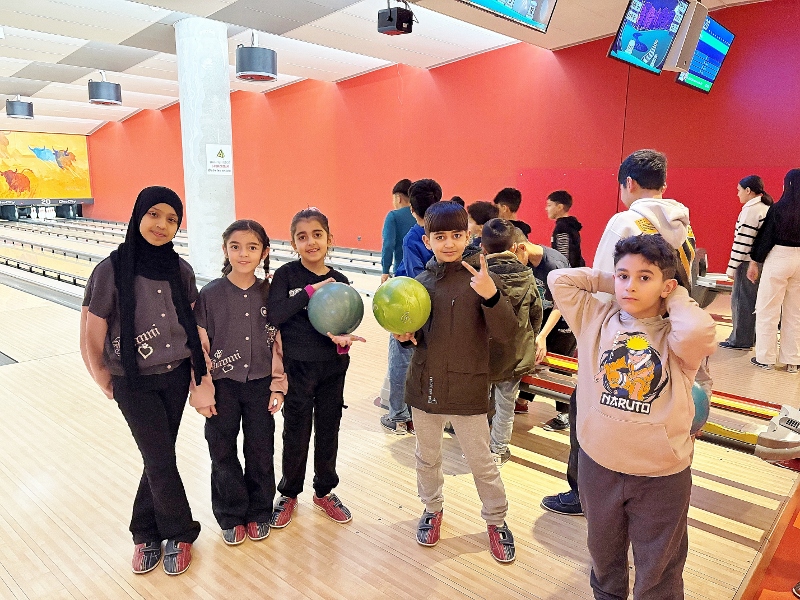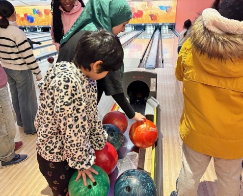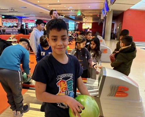 Die Köpfe im Nacken beobachten die Kids des Lerncafe Concordia der Caritas den Punktestand. Schließlich will man nicht nur spielen, sondern auch gewinnen! Für viele der Kinder ist es das erste Bowlingerlebnis und auch der erste Ausflug mit dem Lerncafe. So mancher Stöpsel müht sich noch mit der großen Kugel, aber wenn die eigene Lieblingsfarbe heranrollt, heißt es schnell sein und dann wird gut auf das schöne Rund aufgepasst.