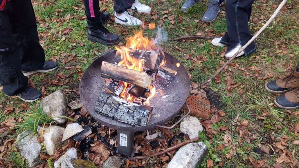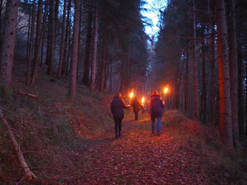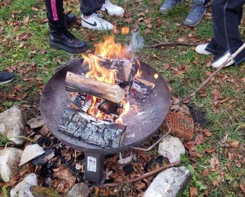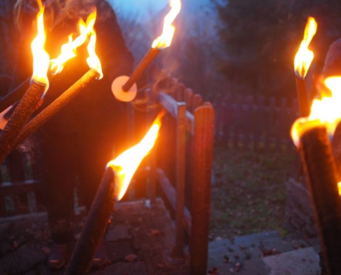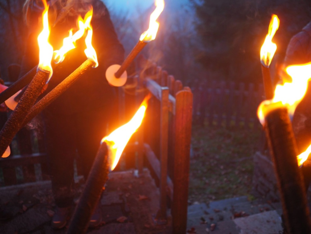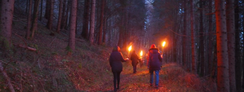Inzwischen war es dunkel geworden – für eine kleine Fackelwanderung waren alle rasch zu begeistern. Aber es gab noch eine Überraschung – am Weg waren Bilder aus dem Leben des hl. Nikolaus versteckt. Einmal gefunden fügten sie die Kinder wieder zu seiner Lebensgeschichte zusammen – und siehe da, in der Hütte wartete ein großer Nikolaussack, wo für jede und jeden ein kleines Päckchen zu finden war. Mit Tee und Keksen ließen wir den Tag ausklingen. Vor Aufbruch nützten einige auch noch die Zeit, um vor der Hütte (Hexe) zu spielen und herumzutollen.