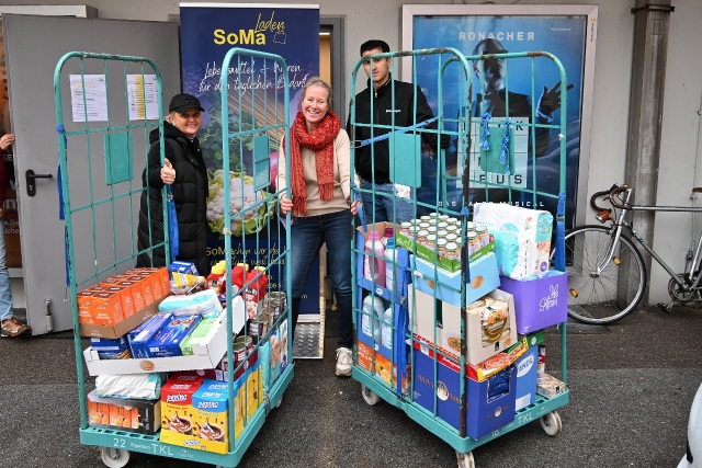 Im Geschäft herrscht reges Treiben, großteils haltbare Produkte reihen sich neben Getränken, Second-Hand Kleidung und Kuscheltieren. Die Weihnachtszeit wird mit dem Aufstellen des Christbaums auch hier gerade eingeläutet. Durch die wertvollen Kooperationen zu den Lebensmittelketten stehen die Regale nie leer. Zusätzlich hocherfreut zeigen sich die SOMA Märkte, wenn – wie heute in Rahmen des VZ Adventkalenders – Unternehmen firmenintern Produkte sammeln und spenden.