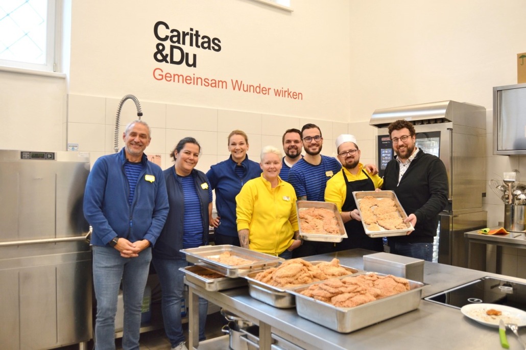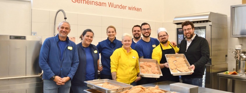 Das war ein feines vorweihnachtliches Menü, das die Managementcrew von IKEA Südösterreich an diesem Tag im Rahmen des VZ Adventkalenders im Marienstüberl der Caritas Steiermark in Graz für die Gäste, es sind Menschen in Not, gezaubert haben. Es wurden insgesamt 30 Liter einer kräftigen Gemüsesuppe gekocht und 280 Putenwienerschnitzel mit Erbsenreis zubereitet. Zum Abschluss hat das Firmenteam Muffins mitgebracht. Gottfried Kienzl, Market Manager des schwedischen Möbelhauses an den Standorten Graz und Klagenfurt, ist sichtlich zufrieden, wenn auch ein wenig müde. „Ich habe die Schnitzel paniert“, lacht er.