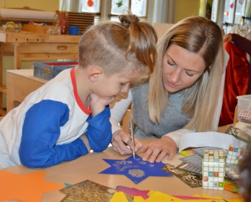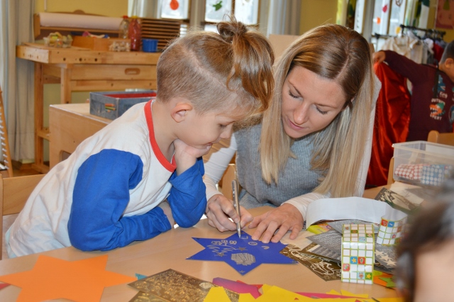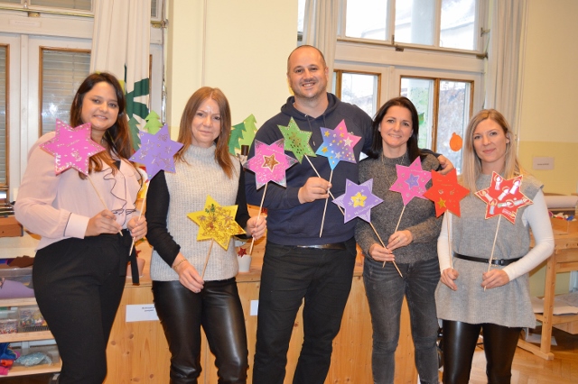 Und so sitzen die Kolleg:innen der Kärntner Sparkasse diesmal auf kleinen Sesselchen um den Tisch in der KinderStadt des Hilfswerk Kärnten im Klagenfurter Rauscherpark und schneiden, kleben, plaudern und lachen. Mit den Kleinen, die hier stundenweise und ohne Anmeldung kommen können, wenn ihre Eltern für kurze Zeit eine Betreuung brauchen, basteln sie an diesem Tag zu Beginn des Advent sogenannte Wunschsterne. „Die werden mit Wünschen von uns und von den Kindern verziert und dann in der Kinderstadt aufgestellt, damit alle Wünsche in Erfüllung gehen“, erzählt Korenjak. Mit dem fünfjährigen Abdullah hat er schon engen Kontakt geknüpft und auch einige Sätze auf Arabisch gesprochen. „Meine Mutter spricht ebenfalls arabisch, deshalb kann ich das und dann ist das Eis natürlich gleich gebrochen“, erzählt er. Gemeinsam mit seiner dreijährigen Schwester kommt der Bub derzeit hierher, während ihre Mutter den Deutschkurs besucht.
