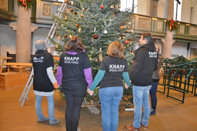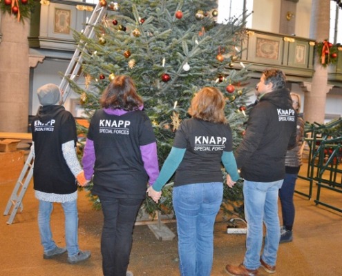 Und so wird an diesem Tag im Kircheninnenraum ein hoher großer Christbaum festlich geschmückt und es werden die Verkaufsstände aufgestellt und geschmückt. Viele Handgriffe, die dank der engagierten Mitarbeiterinnen und Mitarbeiter von KNAPP leicht und zügig von der Hand gehen. Morgen kommt das Unternehmen übrigens noch einmal zur Mithilfe. Dann stehen 13 Lehrlinge und ihre Ausbilder am Start – ebenfalls motiviert, einen Beitrag zu leisten. Schön, weil sich so gesellschaftlich oft entfernte Welten verbinden, die in unserer Region allzu oft nebeneinander existieren. Verantwortung zeigen!, weil das Miteinander immer hilft 😊