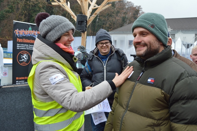 Neben ihr steht Kathrin Olbrich, die seitens LebensGroß für VZ Engagements koordiniert. Sie meint: „Für uns sind die Corporate Volunteering-Aktionen der Firmen so wertvoll, weil Menschen mit Behinderung damit sichtbar werden und Verbindungen zu Leuten aus Unternehmen aufbauen können. Es ist für uns nicht selbstverständlich, dass Ihr immer wieder mit so viel Herz und Offenheit dabei seid und uns eure Zeit und Aufmerksamkeit schenkt.“ Dann ein schnelles Gruppenfoto und dann geht es schon wieder weiter, die nächste Gruppe wartet schon auf die Registrierung. Und auch die Brezelausgabe boomt. Eislaufen macht eben nicht nur Spaß, sondern auch hungrig 😊
