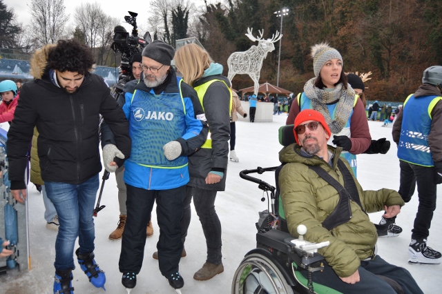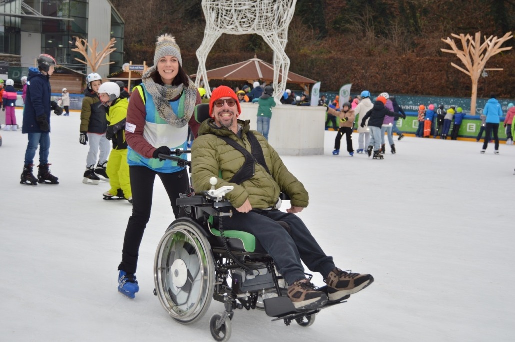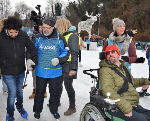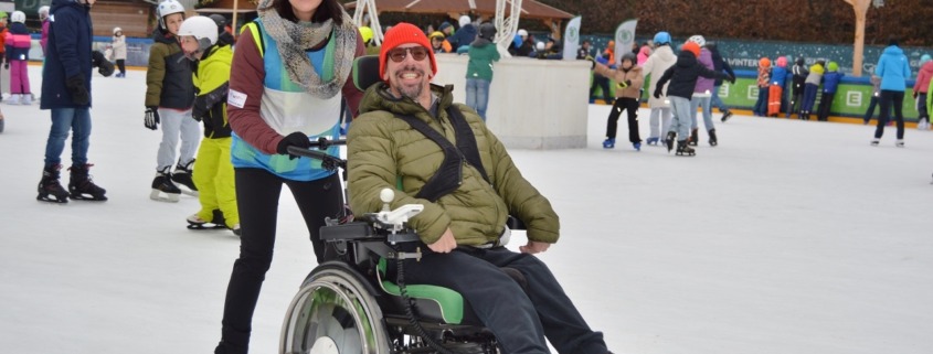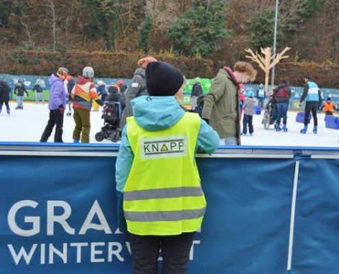 Am Eis drehen ein paar Kollegen mit Menschen mit Behinderung schon seit Stunden ihre Runden, Arm in Arm oder schwungvoll mit dem Rollstuhl. Günter ist auch „VZ Stammgast“ und immer wieder gerne bei den Engagementaktionen dabei, erzählt Bettina Statthaler, die KNAPP-intern alle VZ Engagements seit Jahren mit viel Freude und Leidenschaft organisiert. Es wird von den Teilnehmern hier so eine tiefe Freude verstrahlt, das gibt es im Büro so unmittelbar nicht“, lacht sie.
