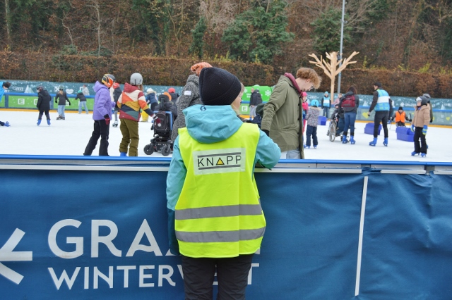 Diese Kurzfassung des VZ Adventkalender-Engagements der insgesamt sieben Kolleginnen und Kollegen von KNAPP deckt nicht alles ab, was dieser Wintertag unter dem Motto „MOI Move on to Inclusion“ hier in der Grazer Innenstadt für und mit LebensGroß zu bieten hat. Dias Firmenteam steht inmitten von wohl mehr als hundert Menschen mit Behinderungen, Gruppen aus unterschiedlichen Standorten, die sich am heutigen Inklusionstag am Eis in der Grazer Winterwelt im Eislaufen versuchen oder sich einfach am Eis wieder einmal sportlich betätigen wollen. Es ist ein cooles Event, bei dem die Mitarbeiter:innen von KNAPP tatkräftig anpacken und der Organisation und Begleitung: Bei der Registrierung und beim Empfang, bei der Ausgabe von Brezeln & co. und natürlich beim Eisstockschießen und am Eis. Da werden stützende Hände und ermutigende Worte mehr als gebraucht und geschätzt.