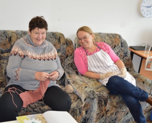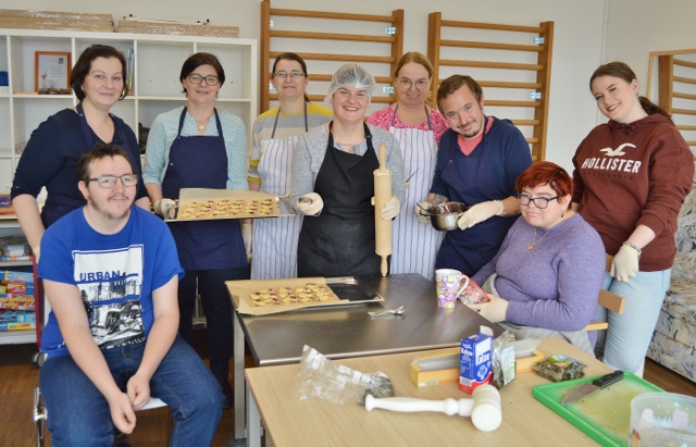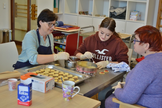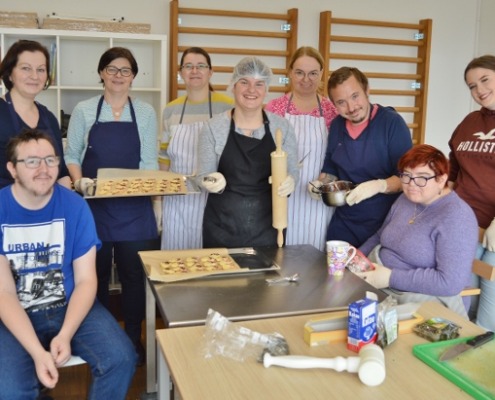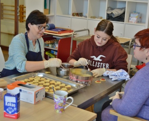 Im Nebenraum stehen weiteren Kolleginnen der Bank um mit den Klient:innen gemeinsam Kekse zu backen. Kürbisstangerl und Linzerkekse werden schon vorbereitet. Wer von den Klientinnen und Klienten mitmachen möchte, werkelt mit, andere schauen zu; es ist eine lustige Atmosphäre. Auf die Frage, wie denn der Tag bisher für die Bankerinnen ist, kommen als Antwort von Prokuristin Anita Kosic „einzigartig“, Martina Schranz „herzlich“ und Helga Stanz beschreibt die Erfahrung als „beeindruckend“.