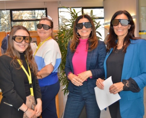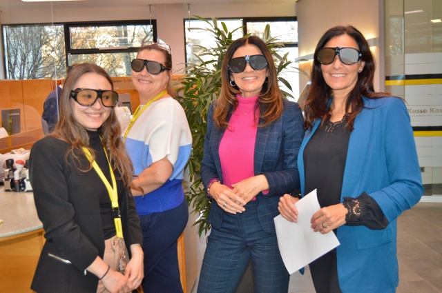 Es ist der Blinden- und Sehbehindertenverband BSVK zu Gast und hat verschiedene Stationen aufgebaut, in denen die Mitarbeiter:innen der Bank in kleinen Teams ihre Sinne schärfen können und mithilfe von Simulationsbrillen in die Welt von Sinneseinschränkungen eintauchen – und mit neuen Erfahrungen wieder auftauchen können.