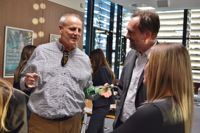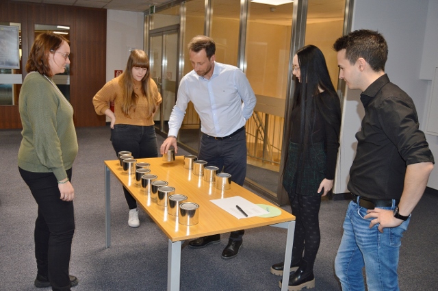 Gesagt getan: Erfolgreich wurden vielfältige Aufgaben bewältigt. Mit Simulationsbrillen am Schalter und beim Bankomaten im Erdgeschoss Geld beheben, im Veranstaltungsplateau im 2. Stock Jenga spielen, mit großen Lupen Überweisungsbelege lesen und erfassen, mit Schwarzbrillen Kegeln, an einer Spür- und an einer Riechstation die eigenen Wahrnehmungen und Sinne jenseits des Sehsinns schärfen. Der Obmann des BSVK Heinz Pfeiffer teilte auch seine reiche Erfahrung im Umgang mit Menschen mit Sehbeeinträchtigungen. „Es sind ja sehr viele auch junge Menschen, die in ihrer Sinneswahrnehmung eingeschränkt sind“, macht er den interessierten Zuhörer:innen bewusst. So konnte an diesem Tag das Thema Diversität und Inklusion mit allen Sinnen erfahren werden und zugleich haben die ‚neuen‘ Kolleginnen und Kollegen sich und auch ihren Arbeitgeber in einem wertschätzenden Kontext kennenlernen können.
