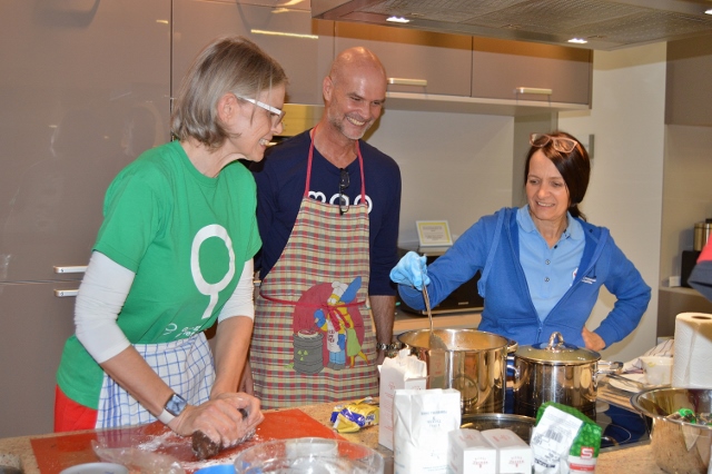 Zu Mittag ist schon viel geschafft und die ersten Keksteller stehen schon zur Verpackung bereit, nicht nur die Zimtsterne sind richtige Kunstwerke geworden. Nun muss das selbstgemachte Lebkuchenhaus Form annehmen und zusammenbebaut werden. Mit Bändern und mit insgesamt neun Händen versuchen die Kollegen, das Haus zusammenzuhalten, während der Zuckerguss als Kleber das Seine tun soll, um das Haus zu stabilisieren. Dank einer Vase im Inneren zur Stabilisierung während der Trockenzeit steht das Haus. Nebenan muss noch mehr Zucker in den Kakoreichen Teig der künftigen Nougatkipferln.