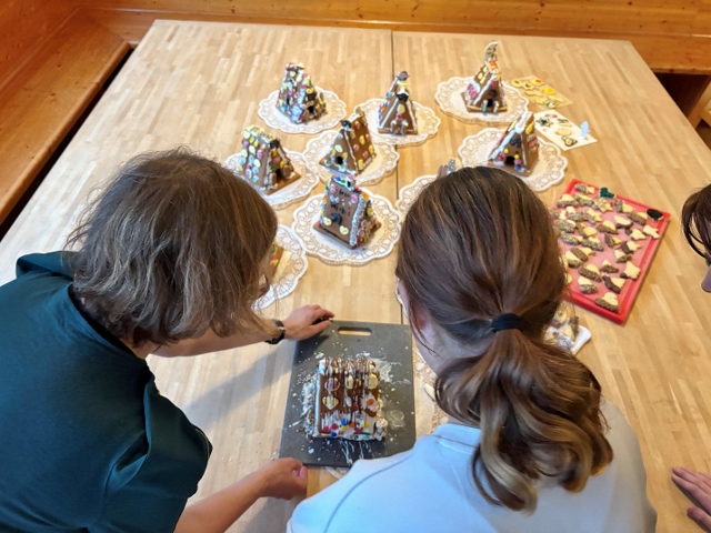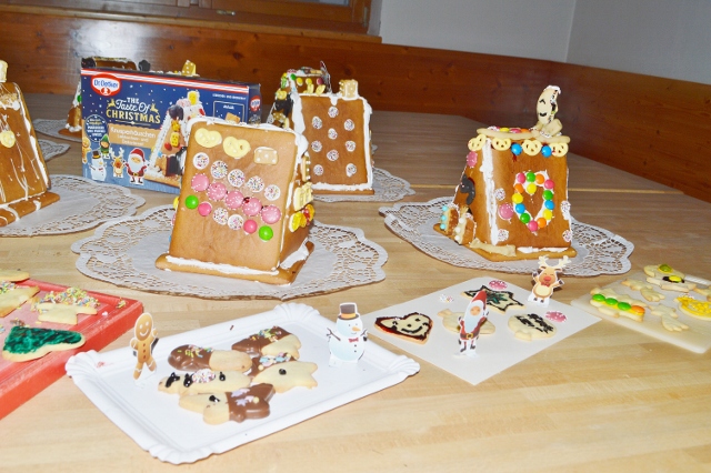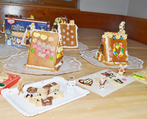 Zu weihnachtlichen Klängen, mit Saft und vielen liebevollen Ideen entstehen als Erstes die bunten Lebkuchenhäuser. Da das FH-Team so groß ist, hat jedes Kind eine eigene Unterstützungsperson zum Zureichen und Beraten. Schließlich sollen die duftenden Bauwerke auch wirklich halten und das tun sie schlussendlich auch, sodass alle ihren Erfolg feiern. Die fertigen Meisterstücke, verziert mit Zuckerguss und bunten Süßigkeiten, zeigen nur allzu deutlich: Gemeinsam gelingt Großes.
