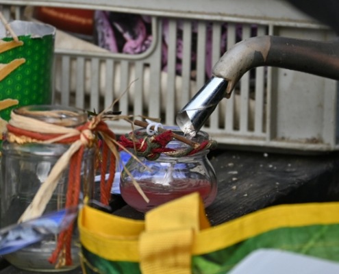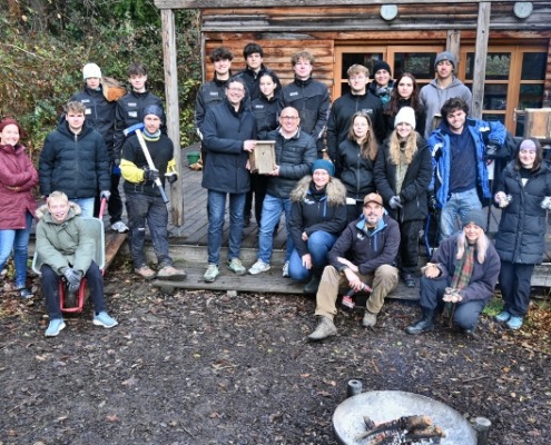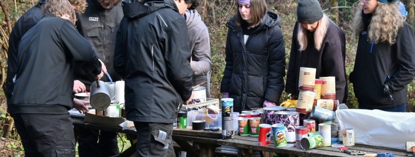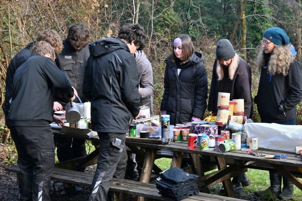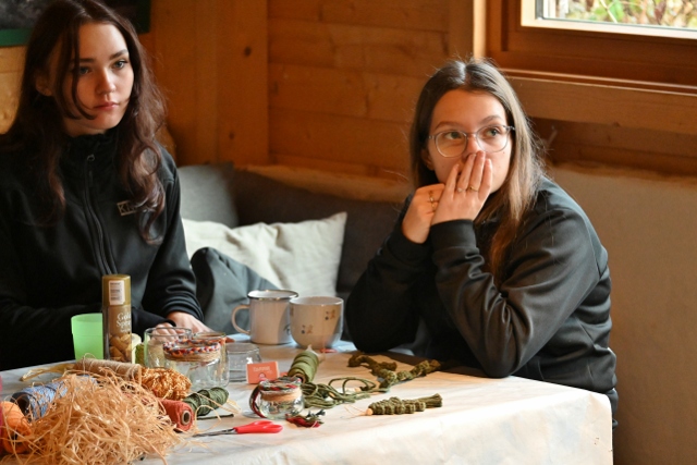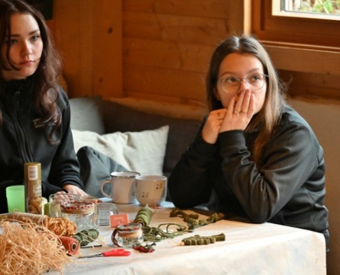 Die Lehrlinge arbeiteten in mehreren Gruppen an unterschiedlichen Aufgaben. In der Hütte wurden Gläser geschmückt, Bänder gebunden und Bastelarbeiten neben dem wärmenden Kachelofen gemacht. Eine weitere Gruppe holte Holz aus dem Wald und hackte es klein, um es als Feuerholz für die Hütte im Winter aufzuschichten. Ein dritter Bereich widmete sich dem Kerzengießen: Wachs aus einer alten Kerzengießerei wurde erhitzt und in Dosen gegossen, wobei darauf geachtet werden musste, dass die Dochte gerade stehen. Zusätzlich wurden Vogelhäuschen aus alten Holzbrettern zugeschnitten, zusammengeschraubt und für den späteren Einsatz vorbereitet.