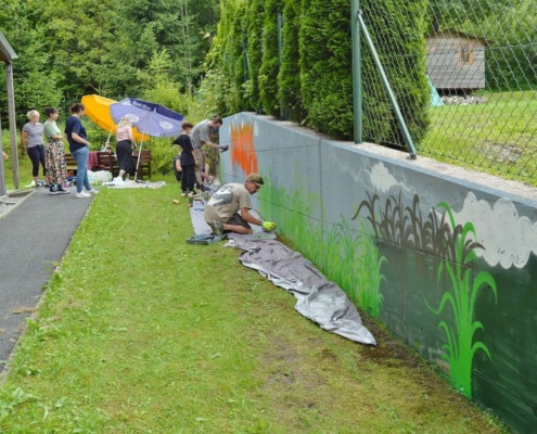 Diakonie de La Tour, Engagementtage, GesellschaftHermagor, 17. Juni 2024. Wie cool, wenn die Sprayer in die WG kommen – das Team der Kärntner Kulturstiftung hat es möglich gemacht: Die lange graue und wirklich unansehnliche Stützmauer im Gartenbereich der Wohngemeinschaft in Hermagor…