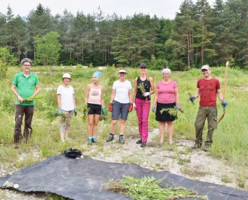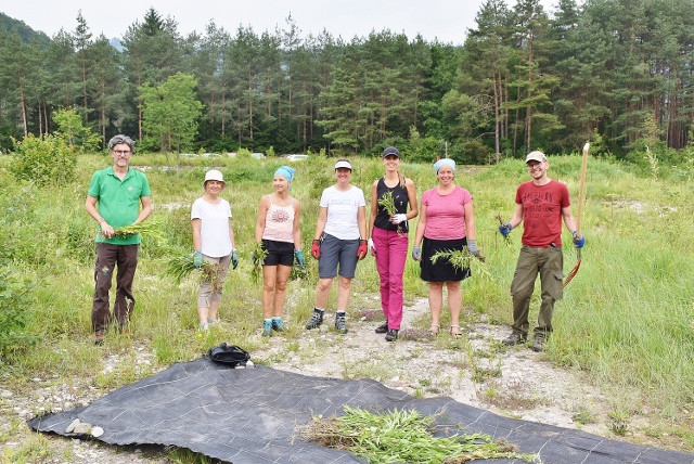 20.6.2024, Villach. Handschuhe und Sonnenschutz waren auch in der Nähe der Villacher Gail gefragt, als es darum ging, die Lebenschancen für die Kiefernsaateule, eine vom Aussterben bedrohte Schmetterlingsart, zu verbessern. Wuchernde Pflanzen wurden vom fleißigen Team ausgejätet und entsorgt, damit die wertvollen Grashorste gut wachsen und die Nachtfalter geschützt leben können. Natürlich gab es vorab eine Expertinnen-Einschulung, um wirklich auch die richtigen Beikräuter zu erwischen. Wer so viel arbeitet, hat sich natürlich auch eine Pause verdient, sodass nicht nur der Rücken durchgestreckt, sondern auch das Miteinander gestärkt werden konnte.