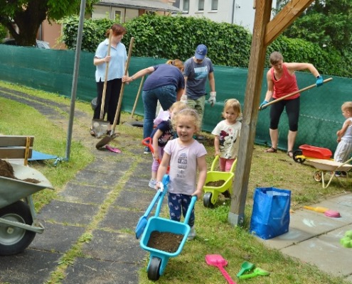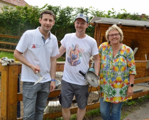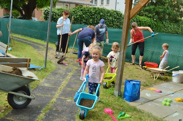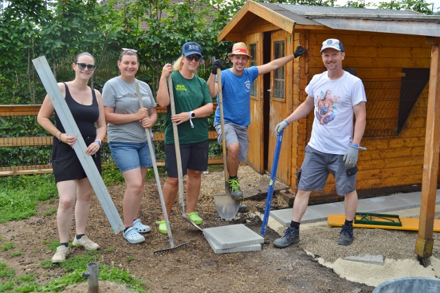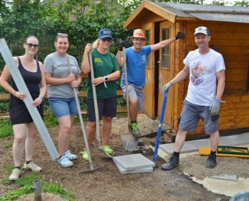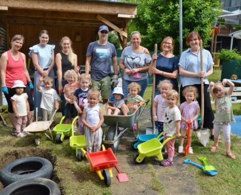 20.6.2024, Klagenfurt. Barfuß im Garten wollten die Kinder der Kindertagesstätte Wiff & Bunt der Kindernest in Klagenfurt sein. Daher wurde im Rahmen des „Mitarbeiter:innen-Engagementtages“ einen Sinnespfad gestaltet: es wurden alte Autoreifen im Boden versenkt, die sichtbare Seite bemalt und mit Fühlmaterial wie Blätter, Steinen usw. befüllt, das die Kinder vorab gesammelt haben. Die übrige Erde haben die Kinder unter größtem Eifer in ihren Scheibtruhen zu einem „kleinen Berg“ gebracht, der dann gemeinsam mit Gras besät wurde. So cool war das!