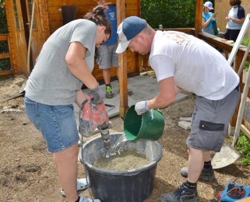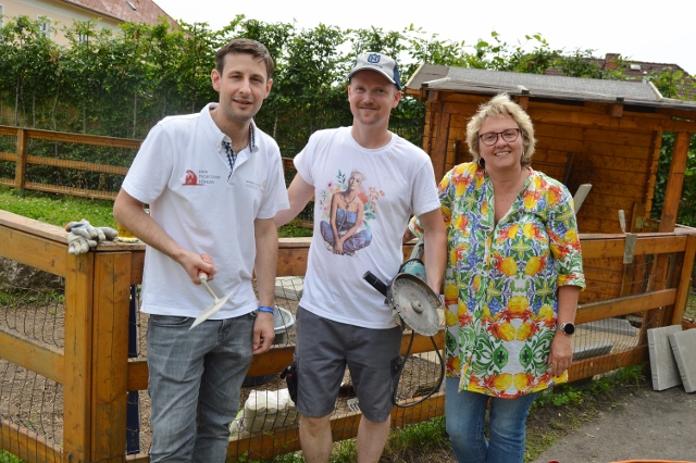 20.6.2024, Klagenfurt. Schöner Wohnen für die Ziegen sollte es im Wohn- und Pflegeheim Haus St. Peter der Diakonie de La Tour in Klagenfurt heißen, denn der Dauerregen letzten Sommer hat ihrem Gehege sehr zugesetzt. So hat ein Team des Landes im Rahmen des „Mitarbeiter:innen-Engagementtages“ im Eingangsbereich des Gartenstalls neue Waschbetonplatten verlegt, damit das Füttern wieder ohne nasse Füße möglich ist. Die Ziegen haben interessiert zugesehen und auch die betagten BewohnerInnen des Hauses waren von der Abwechslung angetan.