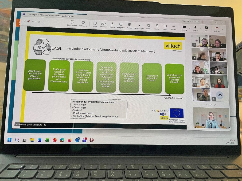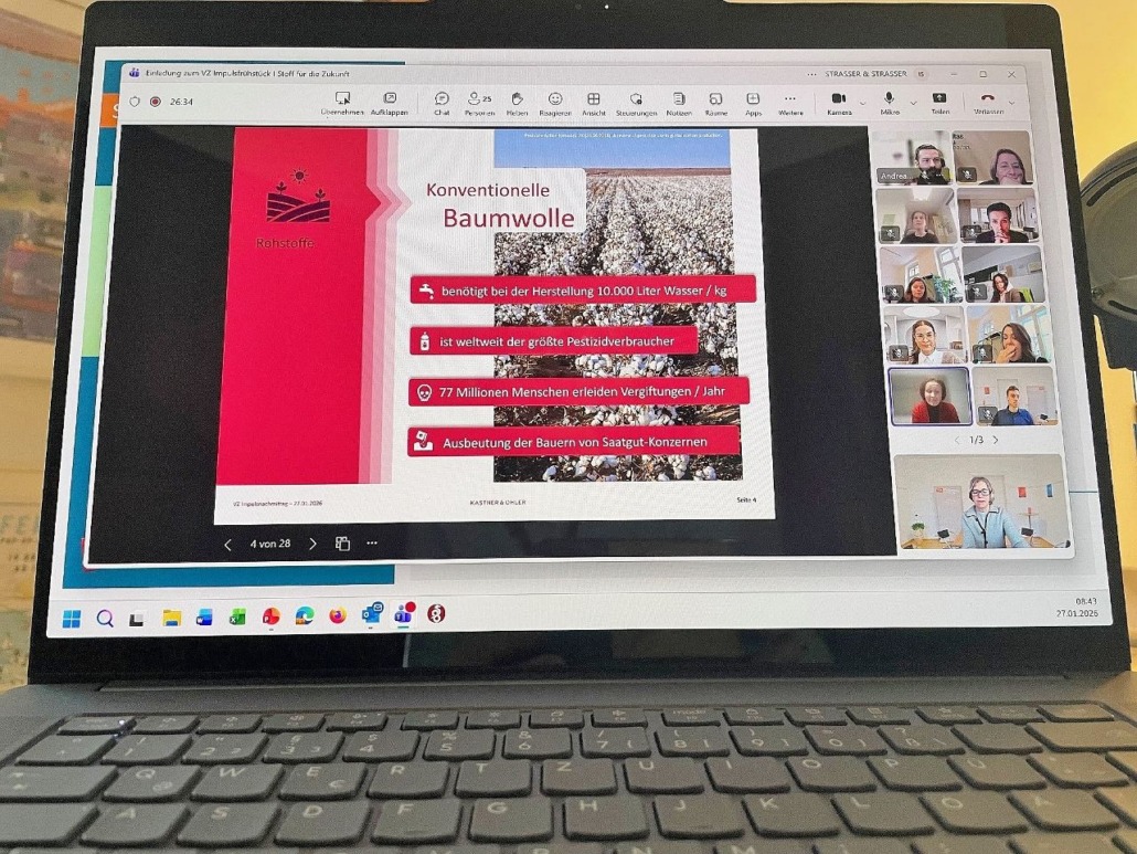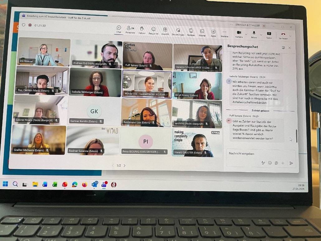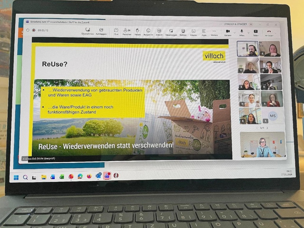 online, 27. Jänner 2026. Zum fachlichen Auftakt des Jahres lud das Netzwerk Verantwortung zeigen! zum ersten VZ Impulsfrühstück 2026. Unter dem Titel „Stoff für die Zukunft“ stand die Frage im Mittelpunkt, wie Kreislaufwirtschaft konkret und wirksam umgesetzt werden kann und verdeutlichten die vorgestellten Beispiele von Kastner & Öhler und Saubermacher sowie von Stadt Villach und die ARGE Sozial, wie die Umsetzung in Kooperation gelingt; mit Anregungen für viele Branchen.