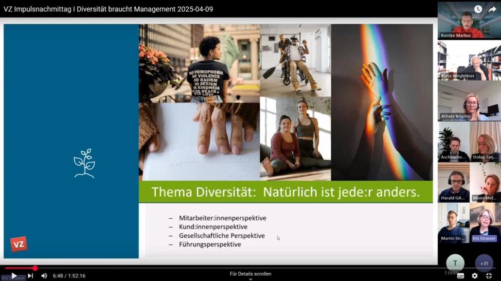 online, 9. April 2025. Wie kann Vielfalt – bewusst gestaltet – eine positive Unternehmenskultur schaffen und langfristig die Mitarbeiterzufriedenheit und die Innovationskraft erhöhen? Dieser Frage widmeten sich im Rahmen des VZ Impulsnachmittags „Diversität braucht Management“ Führungskräfte und Fachverantwortliche aus mehr als 40 Unternehmen. Anregt durch beeindruckende Impulsbeiträge von KNAPP, REWE Group/BILLA, RLB Kärnten und Diakonie de La Tour wurden Ansatzpunkte und Erfolgskriterien eines wirksamen Diversitätsmanagements aufgezeigt und Potentiale der bewussten Auseinandersetzung mit dem Thema sichtbar.