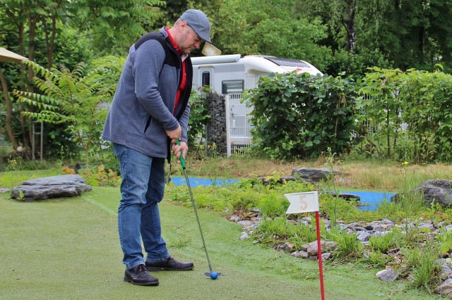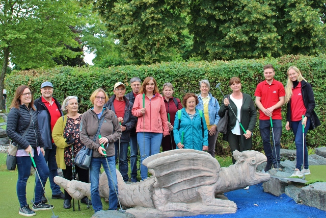 Die Bälle rollen lassen – ein Team von Mitarbeiterinnen und Mitarbeitern der Arbeiterkammer Kärnten erwartete freudig die mit dem Zug angereiste Gruppe des Sozialpsychiatrischen Tageszentrums Villach von pro mente am Minigolfplatz beim Klagenfurter Strandbad. Im Rahmen eines gemeinsamen Verantwortung zeigen! Engagementtages stand ein lustiges Sporterlebnis am Programm. Nachdem drei gemischte Gruppen gebildet waren, ging es miteinander schon los auf dem Parcours der Adventure Minigolf Anlage in der Wörthersee Ostbucht.