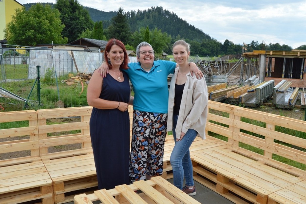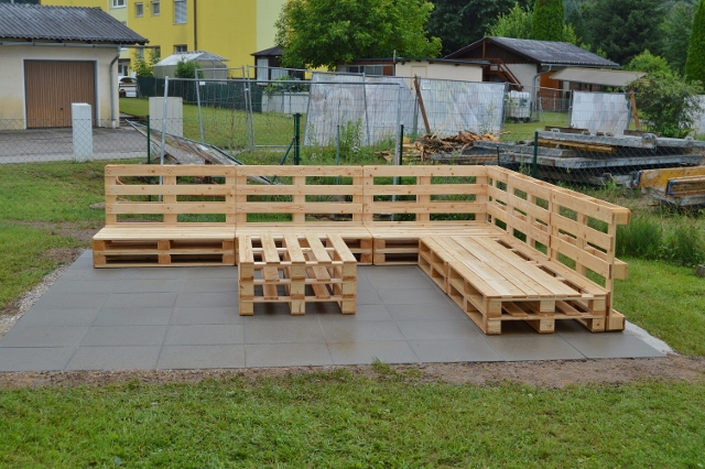 Was für eine tolle neue Paletten Möbel-Garnitur, die dank der Tatkraft und Motivation des MitarbeiterInnenteams der Kärnten Netz GmbH hier im Wohnverbund von autArK in Griffen im Rahmen des VZ Engagementtages gebaut wurde. Gemeinsam mit den KlientInnen, die hier wohnen haben die Kolleginnen und Kollegen des Netzbetreibers eine große Eckbank und einen tollen Tisch zusammengebaut und dies auf ein sicheres Fundament und eine stabile Sockelplatte stellte. So wurde der neu gestaltete Garten nun zu einer richtige gemütlichen Chill-out-Area. Auch wenn es an diesem Nachmittag beim Projektbesuch des VZ Teams mit der Kamera dann geregnet hat und die Polsterung ins Trockene musste – der Sommer kann kommen! 😊