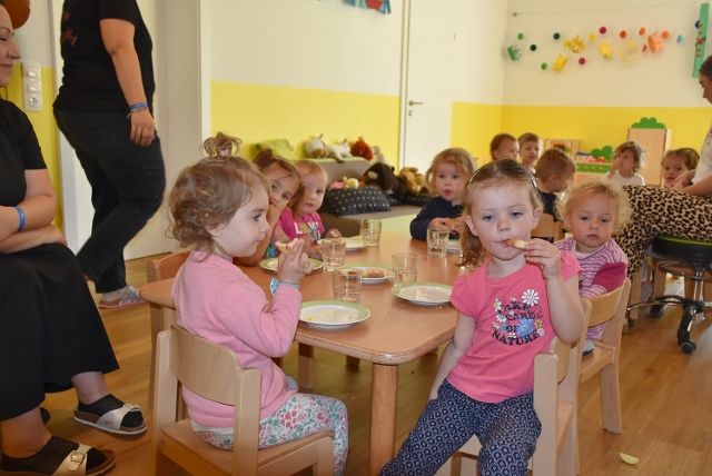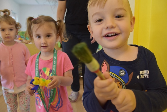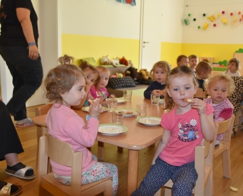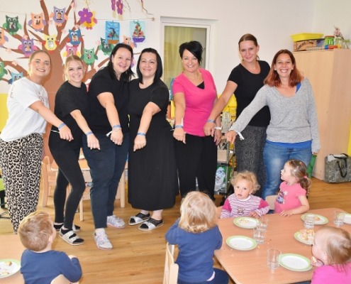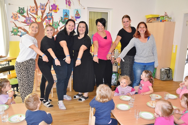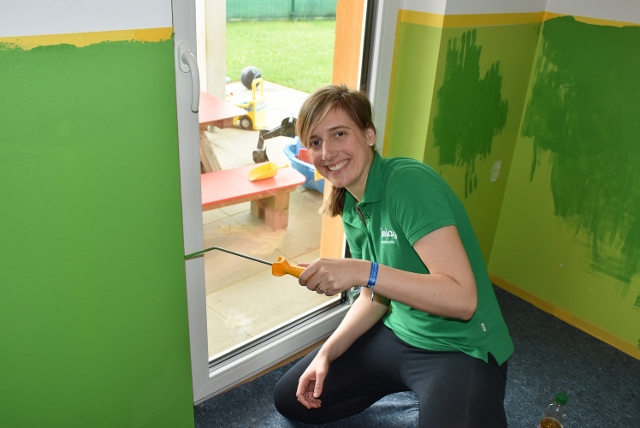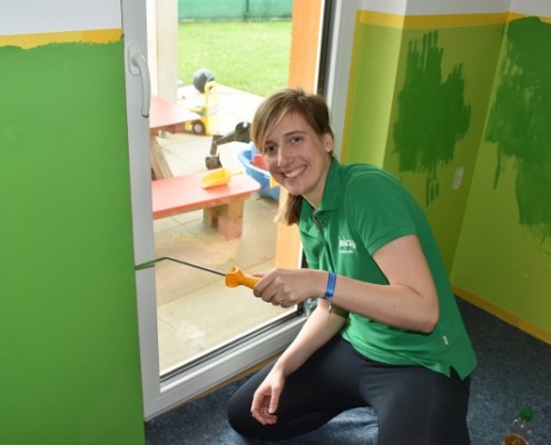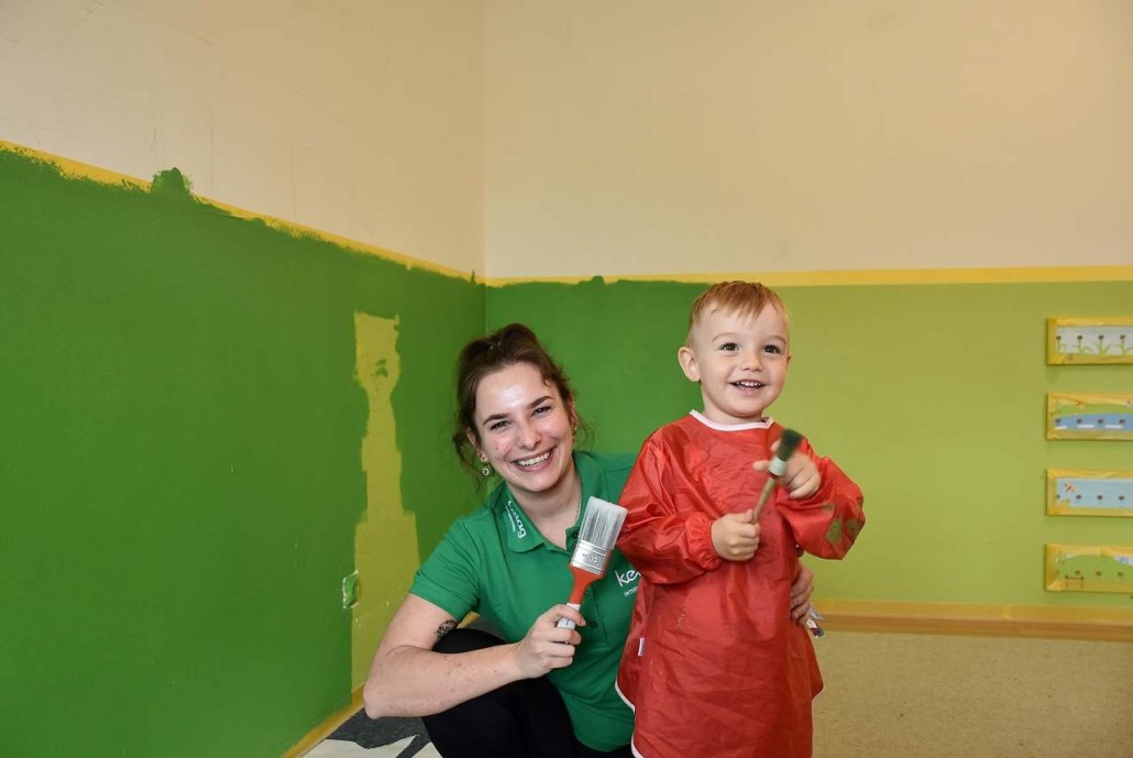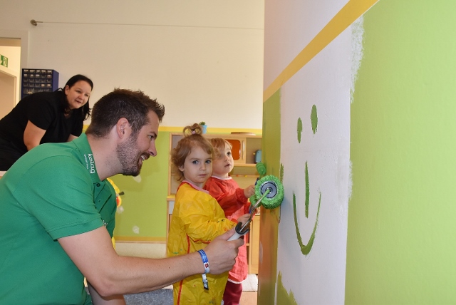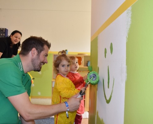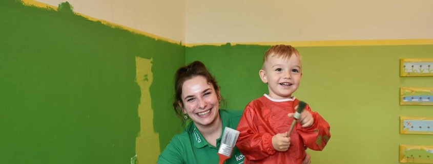 Grün, das sich sehen lassen kann! Bestens gelaunt und mindestens genauso gut ausgestattet kam das Team der Kelag International nach Launsdorf, um mit den kleinen Burgwichteln ihren Gruppenraum frisch auszumalen. Dabei wurde ein breites grünes Band als Wiese gemalt, aus der ein wunderschöner Zauberbaum wachsen sollte. Mit großer Freude malten auch die Kinder mit, bis es in die erste Pause ging. Zur Feier des Tages gab es als Jause heiße Brote und frisch gebackenen Kuchen, was allen sichtlich schmeckte und Kraft für die weitere Arbeit spendete. Während das fünfköpfige Kelag-Team weiter beste Maßarbeit leistete, durften die Kinder in ihre Gummistiefel schlüpfen und sich im Garten austoben. Nach der Gesamtrenovierung wurde noch einmal ordentlich mit Farbe gekleckert, sodass viele bunte Blätter aus Kinder-Handabdrücken zum Zauber des Baumes beitragen konnten.