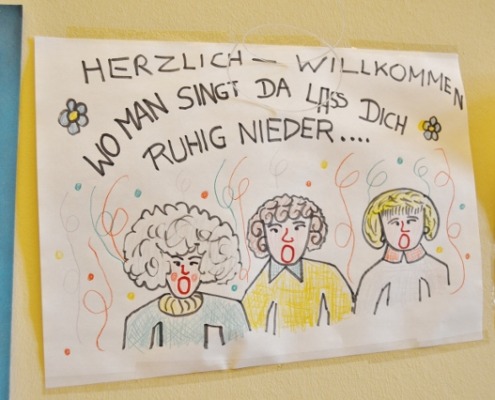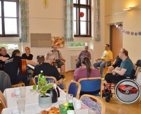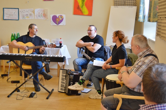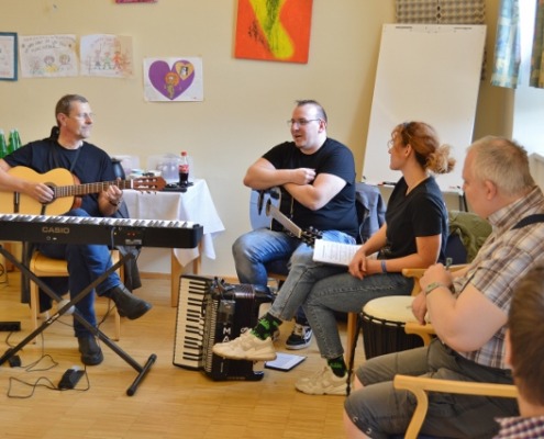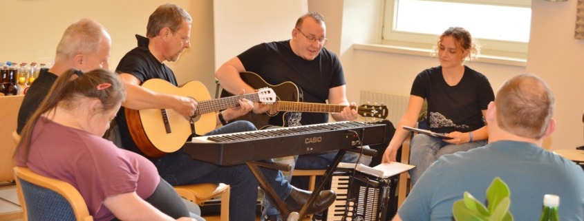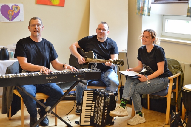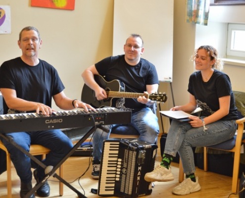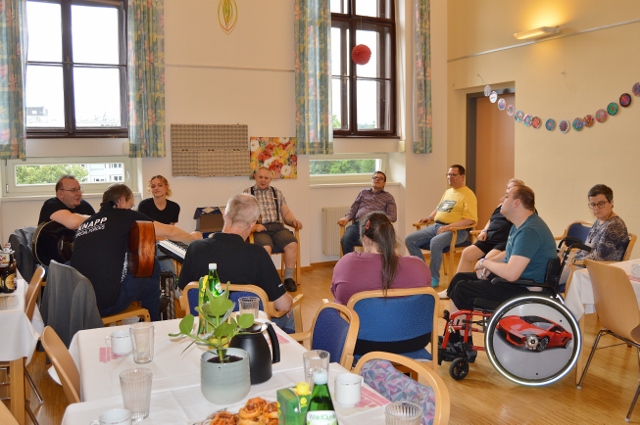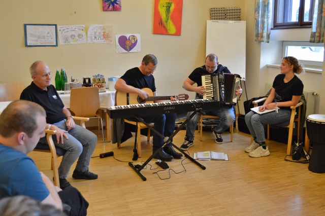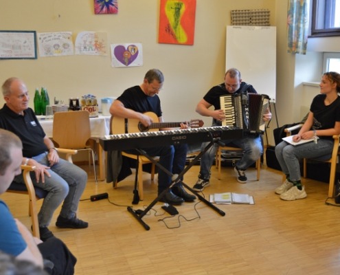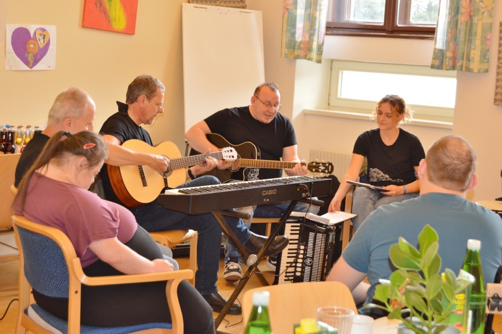 Musik verbindet Welten – und so war es auch ein bisschen an diesem Nachmittag: Drei Kolleg:innen der KNAPP AG haben ihre Instrumente und ihre Leidenschaft für die Musik ins Wohnheim des Odilien-Instituts in Gaz mitgebracht und mit den Musik-begeisterten Klientinnen und Klienten, die hier wohnen, in kleiner Runde einen unvergesslichen Nachmittag verbracht. Es wurde musiziert und getanzt und miteinander gesungen. Sogar Willkommenszeichnungen waren vorbereitet und zierten die Wände des Schulungsraumes, der zum kleinen Konzertsaal wurde. „Wo man singt, da lass dich ruhig nieder“, konnte man lesen und „Gemeinsam statt einsam…“ – und das war dann an diesem sehr emotionalen Nachmittag für alle genau so spürbar.