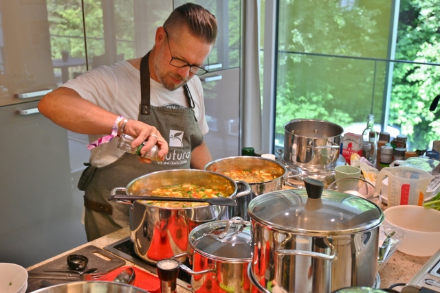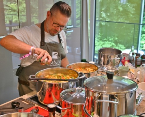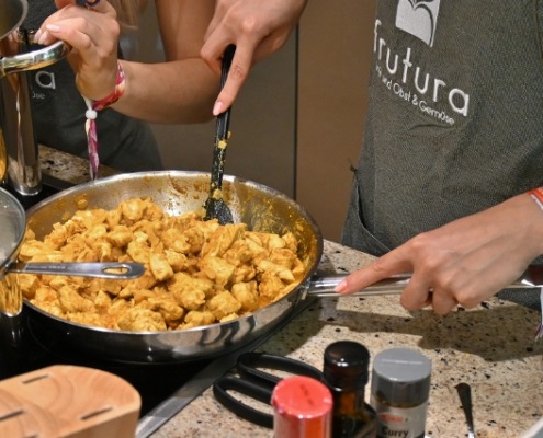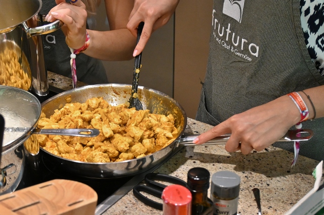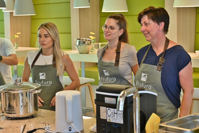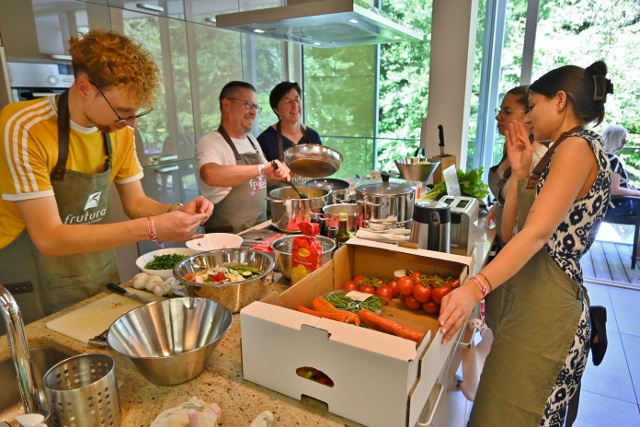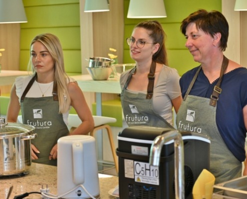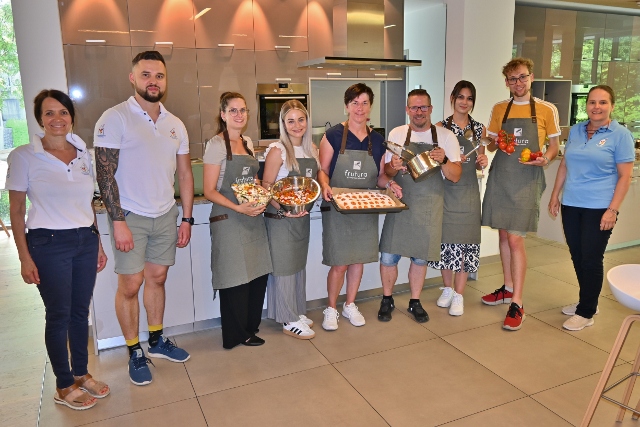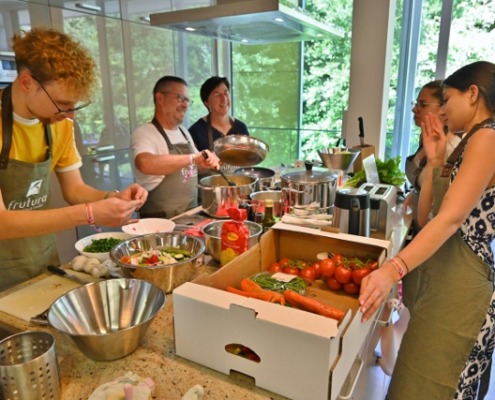 Voll bepackt mit Lebensmitteln aus dem eigenen Lager machten sich die Mitarbeiter:innen der Frutura Obst & Gemüse auf den Weg nach Graz ins Ronald McDonald Kinderhilfehaus, um dort für die Familien und das Team des Kinderhilfe-Hauses ein Mittagessen zu kochen. Nach einem Kennenlernen mit dem Team des Hauses und einer kleinen Tour durchs Haus ging es los: aufgeteilt in „Team Curry“ und „Team Minestrone“ war die erste Aufgabe das Kleinschneiden des Gemüses für die weitere Verarbeitung. In der großen offenen Küche des Hauses roch es schon bald köstlich, die Pfannen begannen zu brutzeln und die Suppe zu kochen. Abschmecken, würzen, umrühren – in harmonischer Teamarbeit konnte so das Essen mit viel Freude und Spaß zwischendurch gezaubert werden. Als Nachspeise gab es einen herrlichen Marillen- und Zucchinikuchen.
