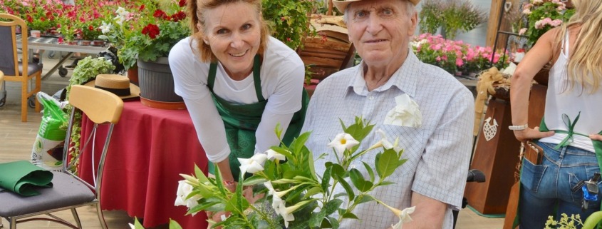 Gut ausgestattet mit vorab gemeinsam gestaltetem grünen Gärtnerschürzen, mit Strohhüten und reichlich Schwung und guter Laune konnte nach einer Führung durch die wunderbare Gärtnerei jede betagte Dame und jeder betagte Herr die eigene Pflanzenschale für das Pflegewohnhaus gestalten. Es wurde wunderbar sichtbar, wie vertraut die alten Menschen mit den Blumen, der Erde und den Gartenarbeiten waren, da kamen viele Erinnerungen hoch, viele Geschichten und auch so manches Kräutergeheimnis wurden ausgetauscht.