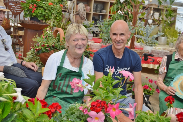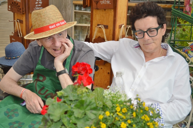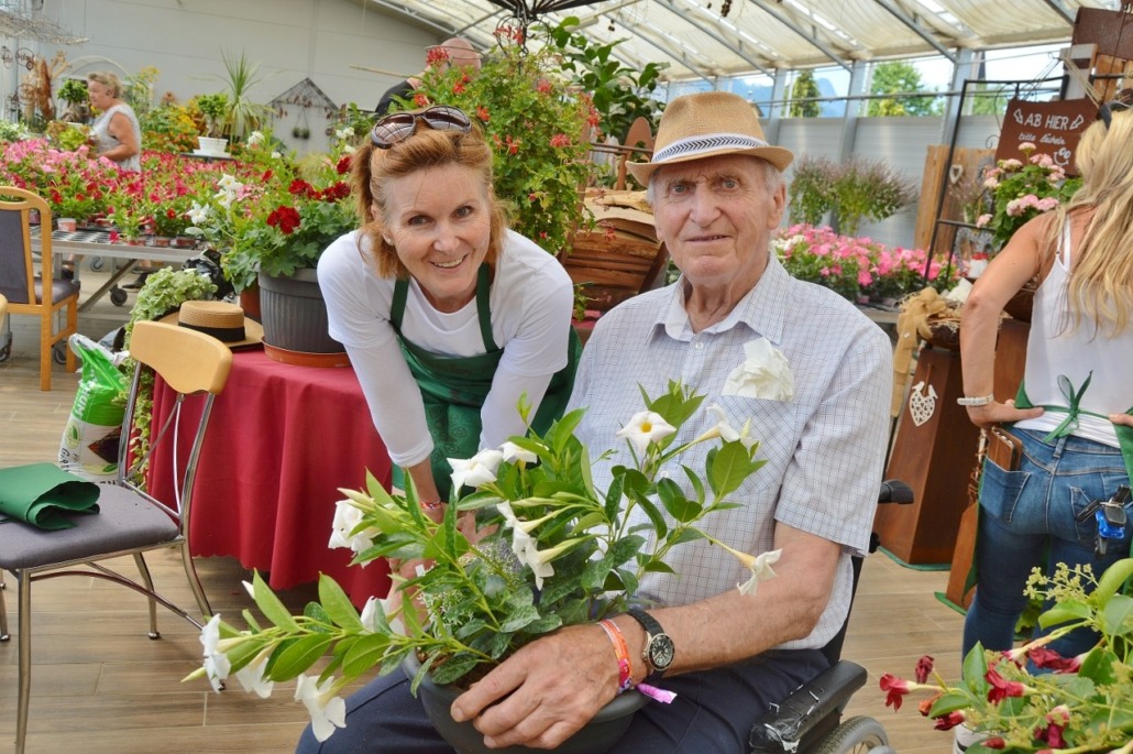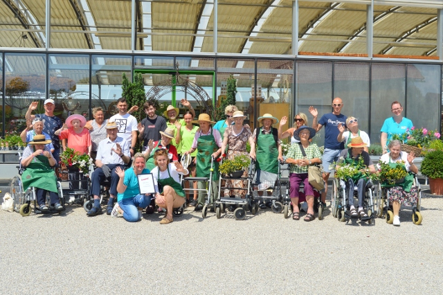 Gut ausgestattet mit vorab gemeinsam gestaltetem grünen Gärtnerschürzen, mit Strohhüten und reichlich Schwung und guter Laune konnte nach einer Führung durch die wunderbare Gärtnerei jede betagte Dame und jeder betagte Herr die eigene Pflanzenschale für das Pflegewohnhaus gestalten. Es wurde wunderbar sichtbar, wie vertraut die alten Menschen mit den Blumen, der Erde und den Gartenarbeiten waren, da kamen viele Erinnerungen hoch, viele Geschichten und auch so manches Kräutergeheimnis wurden ausgetauscht.