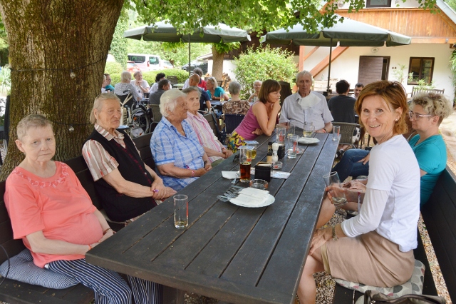 Nach getaner Arbeit wurden die Rollatoren und Rollstühle wieder in den Autos verstaut und es ging zum verdienten angenehmen Abschluss in die Buschenschenke Katschnig bei Ruden. Under großen schattigen Bäumen mundeten Frittatensuppe, Wienerschnitzel und Knödeln einfach herrlich. So ein schöner abwechslungsreicher Tag war das, der den Alltag wertvoll unterbrach und bereicherte – für alle, die dabei waren.