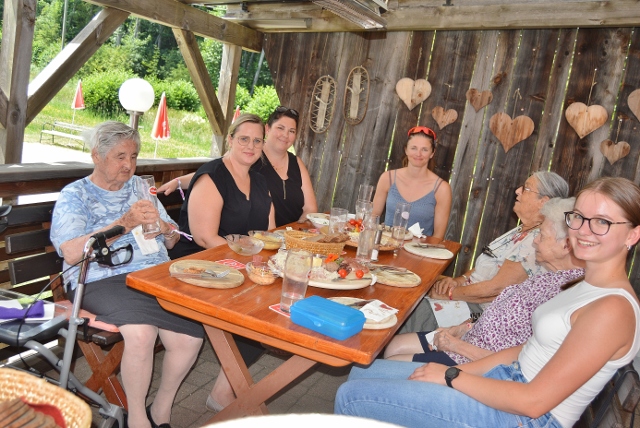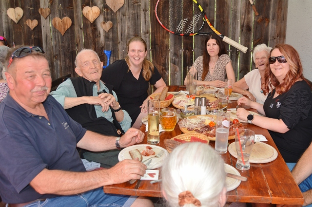 Obwohl der Sommertag wirklich heiß war, lockte dieser VZ Engagementtag 2025 die noch mobilen Bewohnerinnen und Bewohner vom Pflegewohnhaus Haus Theresia der Caritas aus Feldkirchen in das Kräuter Stüberl, eine Buschenschenke im Grünen in der Nähe des Flatschachersee. Dank der perfekten Begleitung und Gesellschaft durch das Team der Kelag Personalentwicklung schmeckten Speck, Most und Reindling köstlich und konnte die bunte Runde auf der schattigen Terrasse des Kräuterstüberls eine wunderbare Zeit verbringen. Geschichten von früher durchzogen den Tag, an dem eines im Vordergrund stand: Zeit für- und miteinander.