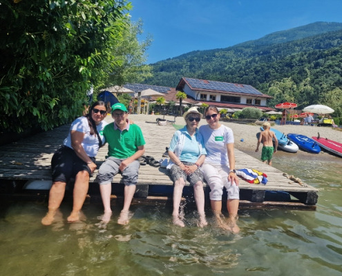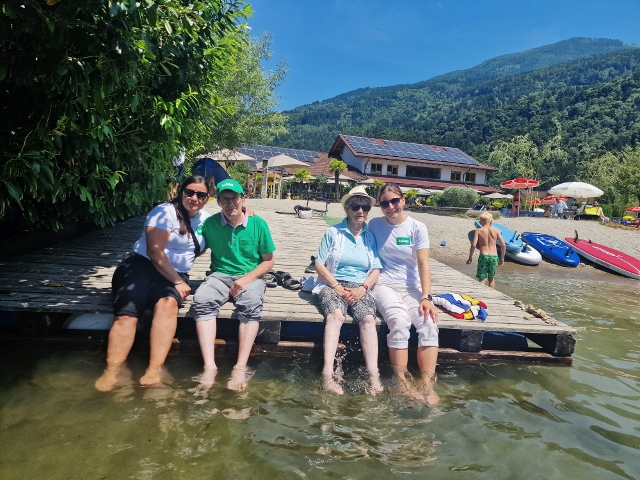 Eine Fahrt ins Blaue führte die betagten Bewohner:innen des Ernst Schwarz Hauses der Diakonie Feldkirchen gemeinsam mit einem Team der Kelag an den malerischen Millstätter See. Bei sommerlichen Temperaturen genossen sie das kühle Blau des Sees, plauderten unter Bäumen, machten eine Einkehr in ein Seegasthaus und ließen sich das Essen schmecken. Ein Musiker spielte Harmonika, während die Gruppe das Seepanorama bewunderte und Geschichten austauschte. Trotz der Hitze wurde auch das Tanzbein geschwungen. Anja Bürger von der Kelag ließ auch mal die Füße im See baumeln und freute sich über den gemeinsamen Tag: „Es ist immer wieder schön zu sehen, wie man anderen Menschen eine Freude bereiten kann.“