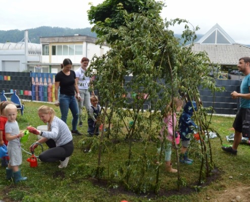 Zum Naschen einladen werden die neuen Beerensträucher entlang des Zaunes der KITA Zauberklang der Kindernest in Ebenthal. Ein Mitarbeiter:innen-Team der Abteilung Controlling der Kelag den kleinen Naschgarten angelegt und damit den Wunsch der Kindertagesstätte im Rahmen der VZ Engagementtage 20025 gerne erfüllt. Aber nicht nur das: in der Nachbar-Kindergruppe Farbenzauber haben die Kolleginnen und Kollegen gemeinsam mit den Kindern ein tolles Weidentipi gebaut – und reichlich eingegossen 😉