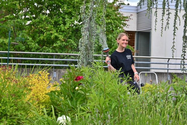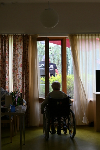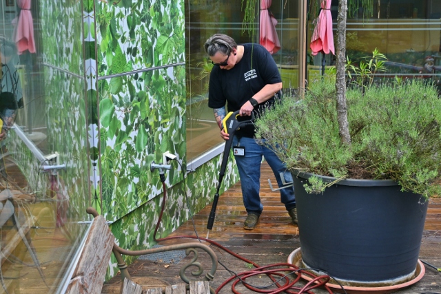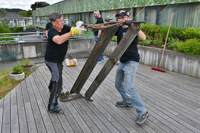 Unter Anleitung eines Gärtners ging es am Vormittag darum, die alten Pflanzen und Gräser zu entfernen, um Platz für die Kräuter und Sträucher zu schaffen. Die 8-köpfige Truppe kam flott voran, sodass bis zur gemeinsamen Mittagspause die Gartenarbeiten großteils fertiggebracht wurden. Am Nachmittag ging es mit neuem Gerät und Elan an die Säuberung der Innenterrasse, der Boden wurde gekärchert, um die Rutschgefahr bei Regen zu verringern und die Fenster geputzt. Auf der äußeren Terrasse wurden lockere Platten mit schlauem Improvisationsgeist fixiert. Das alles natürlich unter neugieriger Aufsicht der Bewohner:innen, die interessiert die Arbeiten beobachteten und kommentierten.