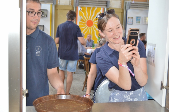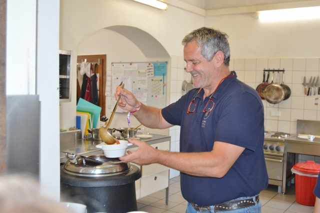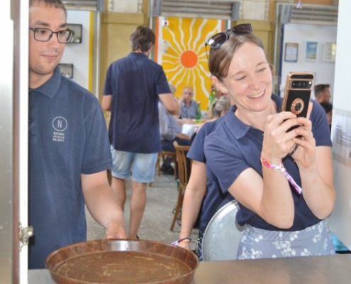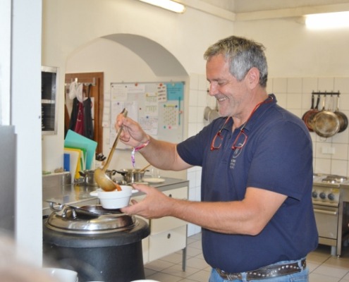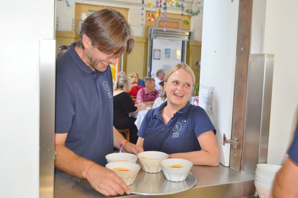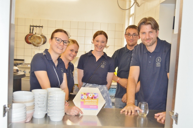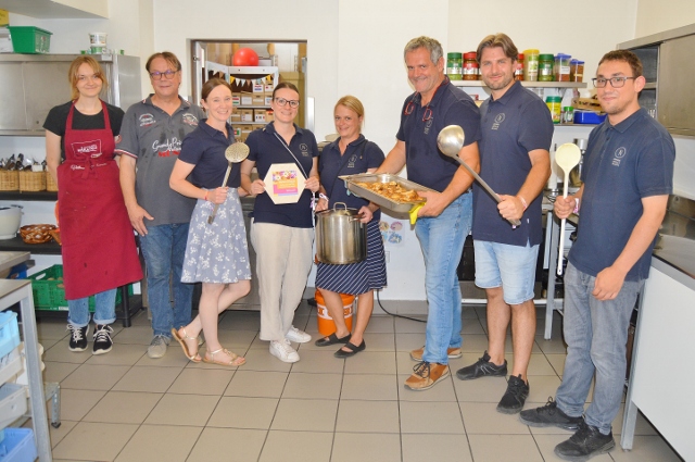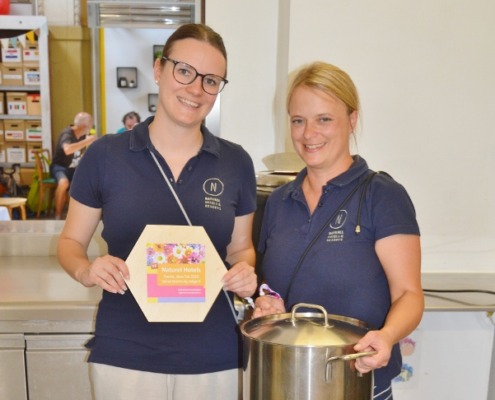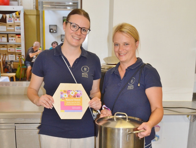 Obwohl schon bald der Mittagstisch für die Gäste der Westbahnhoffnung in Villach, es sind Menschen in verschiedenen Notlagen, geöffnet wurde, war das Firmenteam der Naturel Hotels noch ganz entspannt. Das mehrgängige Essen war in der Hotelküche wunderbar vorbereitet worden und so war der Besuch, der bereits zur guten Tradition geworden ist, ein einfaches Spiel für Junior-Geschäftsführerin Hannah Widnig, ihre Schwester Alexandra Tiefenbacher, die für die Mitarbeiter:innen-Agenden der Hotelgruppe verantwortlich ist sowie die Kolleg:innen aus Marketing, Küchenleitung und Co.. Marjan Kac, der Leiter der Westbahnhoffnung freute sich über die Unterstützung des engagierten und schon aus vergangenen Verantwortung zeigen! Kocheinsätzen gut bekannten Unternehmens, gab es doch nicht nur das dreigängige Menü mit Zucchinicremesuppe, Hühnerfilet mit Spätzle und gedeckten Apfelkuchen, sondern auch für jeden Gast noch ein Säckchen mit kleinen Köstlichkeiten zum Mitnehmen und ganz viel Herzlichkeit beim Servieren der Speisen.