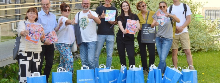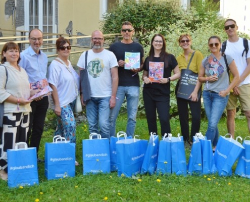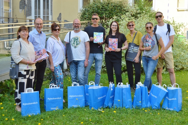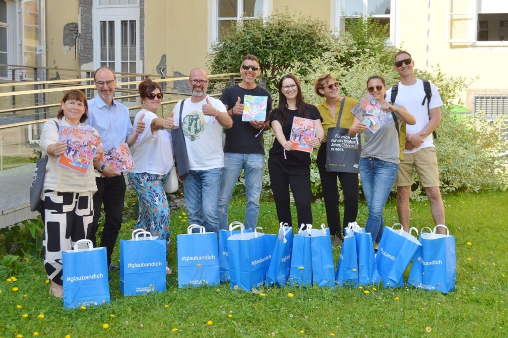 Die über die Caritas betreuten Megaphon-Verkäufer:innen an ihren Standplätzen mit kalten Getränken und einem Lächeln zu überraschen, war für die Abteilung Werbung der Steiermärkischen Sparkasse im Rahmen der VZ Engagementtage das Projekt der Wahl. In der Früh traf man sich im Büro der sozialen Initiative in der Mariengasse, es gab erste Informationen über die Abläufe und Ziele von Megaphon, dann wurde miteinander die Jause zubereitet und die vorbereiteten blauen #glaubandich-Säcke gefüllt. Dann ging es in zwei Touren los: Eine Gruppe machte sich mit Auto und zu Fuß auf Besuchstour in der Grazer Innenstadt, eine zweite Gruppe schwang sich aufs Rad und fuhr, am Lastenrad mit den Säcken bepackt, in Richtung Gösting und Andritz, um dort Verkäufer:innen der Magazine und Kalender – es sind überwiegend Menschen mit Migrations- und/oder Fluchthintergrund – an ihren Standplätzen zu besuchen.