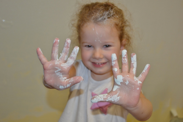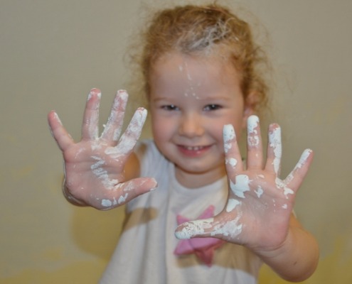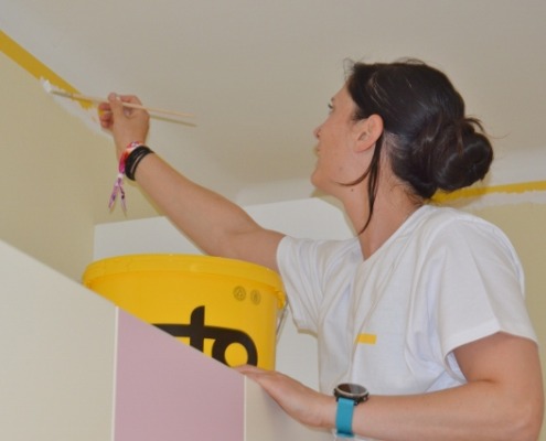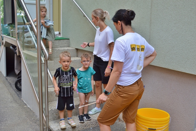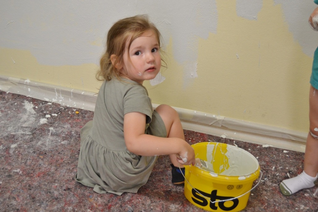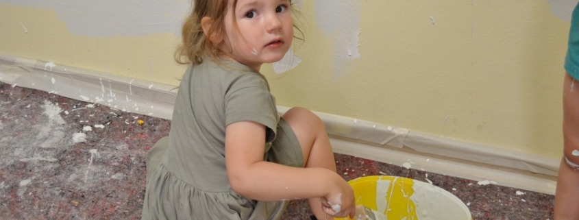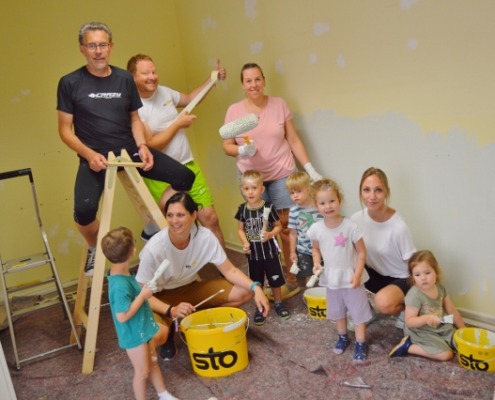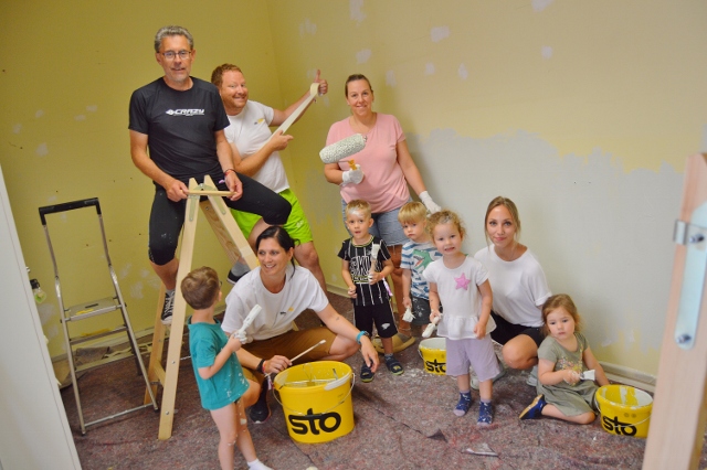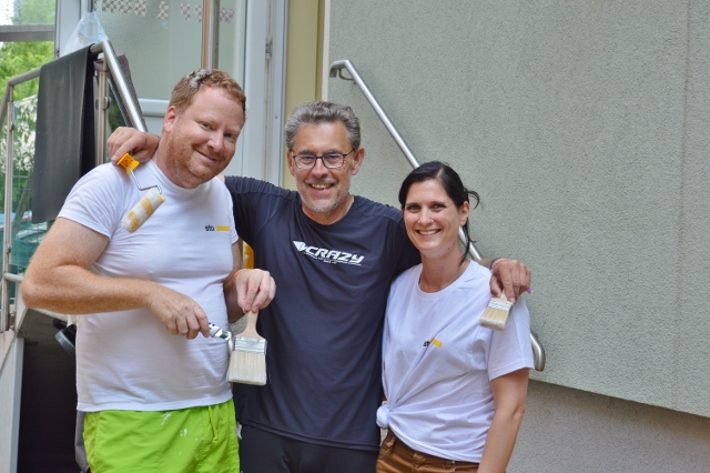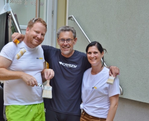 Vor den Dreien steht eine Gruppe kleiner malbegeisterter Mädchen und Buben mit breitem Grinsen und voller Farbe, die mit kleinen Pinseln und großer Begeisterung die Wand anmalen und dabei einander und auch die neuen freundlichen Gäste nicht aussparen. Und irgendwann war es dann genug mit dem Malen und es ging für die Kleinen hinaus in den Garten zum Abwaschen. Das Team von Sto blieb aber natürlich und zauberte den Eingangsbereich des Wiff & Bunt wieder frisch und neu.