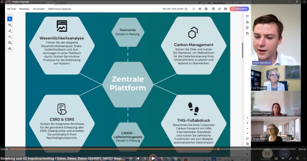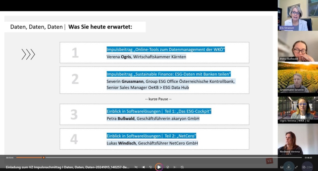 online, 15. Oktober 2024. Unter dem Titel „Daten, Daten, Daten“ bot der VZ Impulsnachmittag Unternehmen fundierten Einblick in unterschiedliche Lösungen, die darin unterstützen, das Nachhaltigkeits- und ESG-Datenmanagement softwaregestützt auf- und auszubauen.