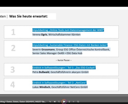 Die Anforderungen von Unternehmen hinsichtlich Softwareunterstützung im ESG-(Daten)Management sind unterschiedlich, die Lösungen sind es ebenfalls. Ob durch die Berichtspflichten der CSRD, Anfragen von Banken und/oder Geschäftspartnern – gefordert sind viele (neue) Daten. Daher widmete sich die Verantwortung zeigen! Veranstaltung im Kreis zahlreicher interessierter Umsetzer:innen konkret dem effizienten und nachvollziehbaren softwaregestützten Datenmanagement im Bereich ESG anhand der Beispiele von KlimaPortal, OeKB Data Hub sowie ESG-Cockpit und NetCero. Die Impulsbeiträge zeigen, in welchem Rahmen Nachhaltigkeitsinformationen digital verwaltet und ausgewertet bzw. für Anspruchsgruppen zur Verfügung gestellt werden können.