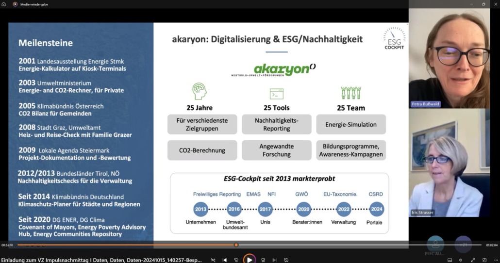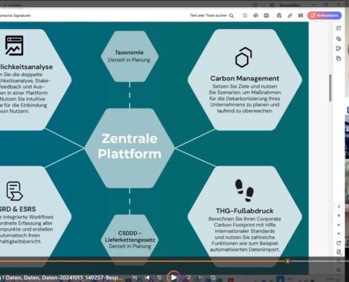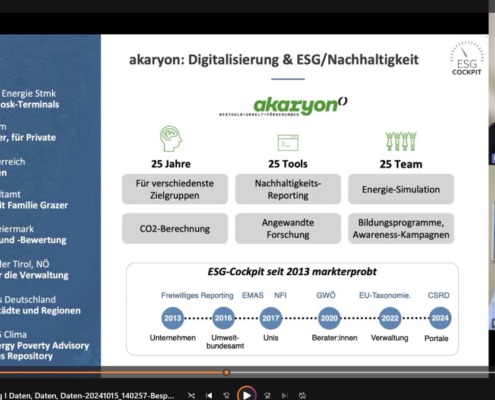 Zunächst zeigte die Geschäftsführerin von akaryon, Petra Bußwald, wie mit dem ESG-Cockpit hunderte Datenpunkte sowie qualitative Informationen periodenrein und prüffähig zu verwalten werden und ein umfassendes Datensystem aufgebaut und sowohl für unterschiedliche Reportingzwecke als auch für die strategische Entwicklung genutzt werden kann. Nachfolgend stellte der Geschäftsführer von NetCero die gleichnamige Software vor, welche Prozesselemente des Nachhaltigkeitsmanagements abbildet und wie Wesentlichkeitsanalyse, CSRD & ESRS, THG-Fußabdruck und Carbon Management digital unterstützzt umgesetzt werden können.