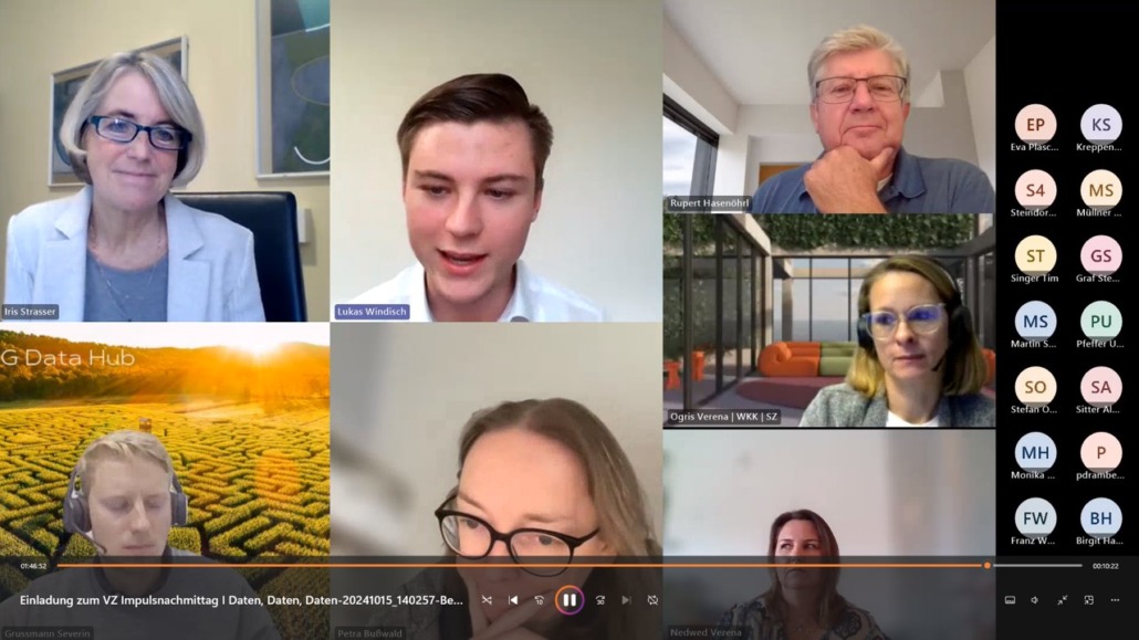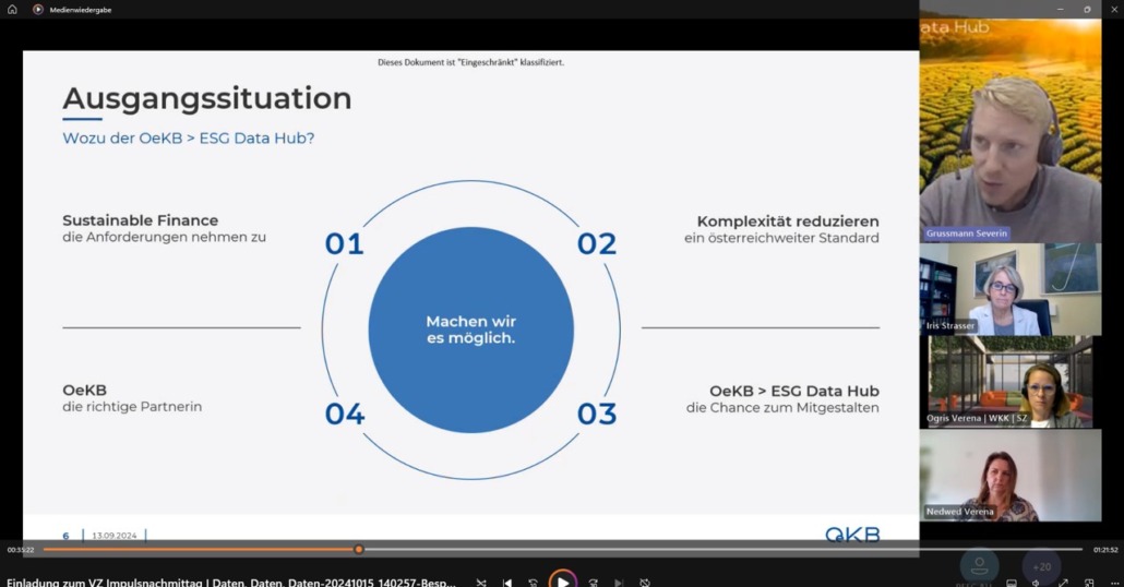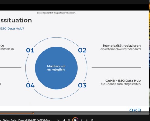 Im zweiten Impulsbeitrag „Sustainable Finance: ESG-Daten mit Banken teilen“ gab Severin Grussmann aus dem Group ESG Office in der Österreichischen Kontrollbank Einblick in den von der Österreichischen Kontrollbank im Auftrag von Banken entwickelten OeKB ESG-Data Hub und zeigte wie Unternehmen mittels standardisierter Fragebögen ESG-Daten sammeln, analysieren und diese in der Folge auch mit Kreditinstituten teilen können.