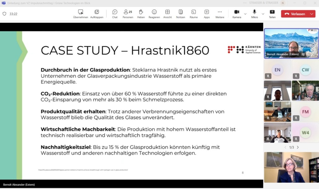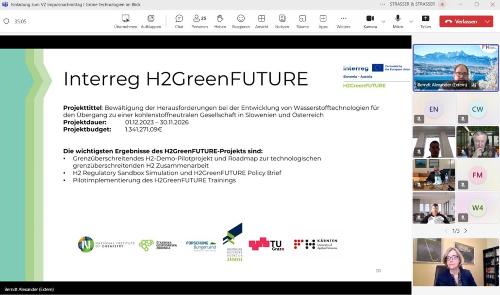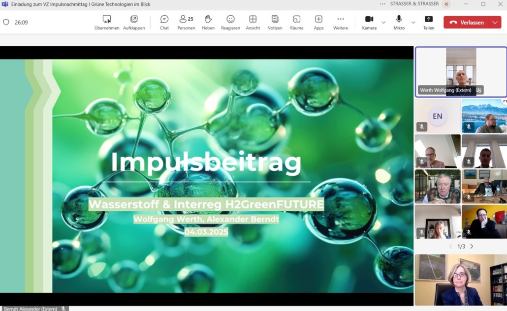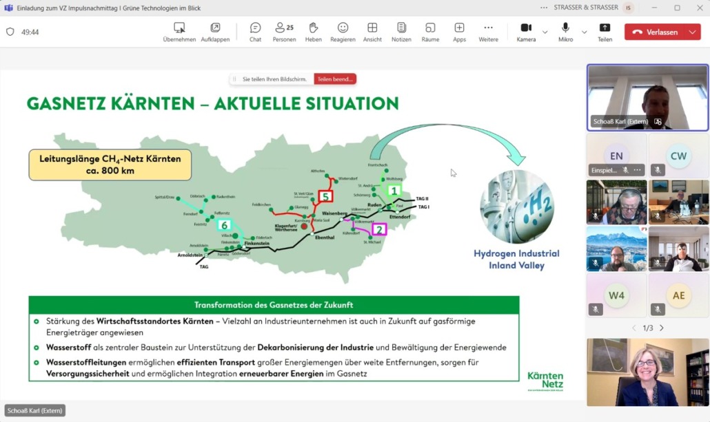 online, 4. März 2025. Zwei Interreg-Projekte, die Vorbereitungen auf das Kärntner Wasserstoffnetz und ein Praxisbeispiel für Kreislaufwirtschaft standen bei diesem VZ Impulsnachmittag unter dem Titel „Neue Technologien im Blick“ mit Impulsbeiträgen von FH Kärnten, KNG-Kärnten Netz, WK Kärnten und HIRSCH Servo am Programm.