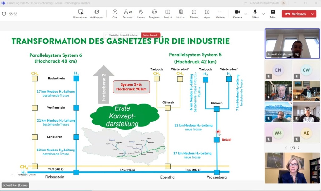 Der Leiter für Gase und technische Services der Kärnten Netz Karl Schoaß schloss in seinem Impulsbeitrag direkt an die Ausführungen der FH Kärnten an, indem er das bestehende Gasnetz in Kärnten darstellte und die Funktionsweise dieses erläuterte. Im Rahmen des Zusammenschlusses Hydrogen Valley arbeiten die Bundesländer Oberösterreich, Steiermark und Kärnten gemeinsam an der Transformation des Gasnetzes hin zum Aufbau eines Wasserstoffstartnetzes für sogenannte „first movers“ aus der Industrie und dem Gewerbe. Neben der Umwidmung einer der drei Röhren der TAG auf der Fernleitungsebene wird auch die Option für ein mögliches H2-Startnetz geprüft. Näher untersucht wird der Aufbau von zwei regionalen Parallelsystemen – eines in Richtung Drautal mit Zielpunkt in Radenthein, eines über Brückl bis nach Treibach und Wietersdorf.