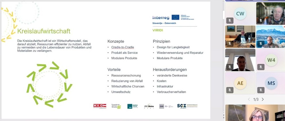 Im, die beiden Ländern Slowenien und Österreich verbindenden Interreg-Projekt VIRIDI arbeiten Partnerorganisationen an dem Ziel der Stärkung der Kreislaufwirtschaft von KMU im Projektgebiet zusammen, berichteten Neža Einspieler und Verena Ogris von der Wirtschaftskammer Kärnten. Hierfür wurden zunächst in Workshops und Fragebögen die relevanten Handlungsfelder ausgemacht, die in einem zweiten Schritt in einer VIRIDI Academy, in geeigneten Geschäftsmodellen und Wertschöpfungsketten resultieren und schlussendlich in einer Plattform für KMUs zur Kreislaufwirtschaft münden sollen. Das Ziel ist es Unternehmen (vor allem in den Branchen Bau, Energie, Kunststoff und Metall, Holz) von einem linearen zu einem zirkulären Wirtschaftsprozess zu begleiten und zu unterstützen. Dazu steht die Einladung sich bei der VIRIDI-Konferenz am 20. März 2025 zu informieren.