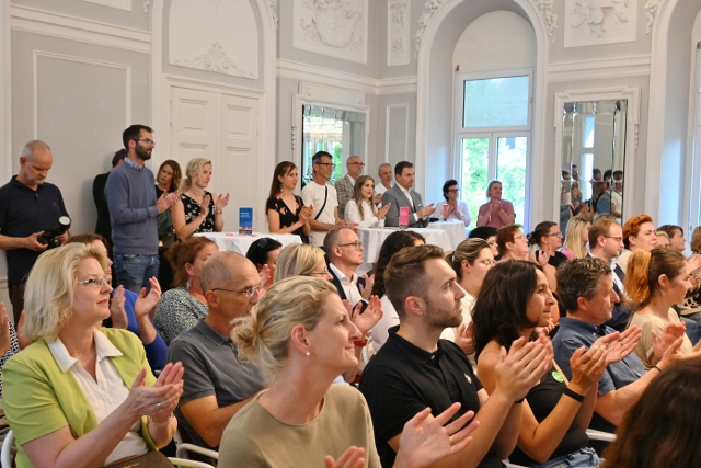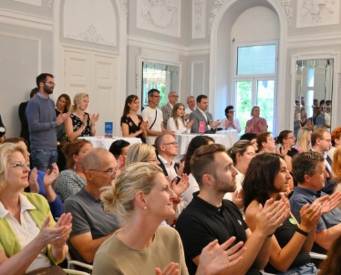 Es ging es ans Danke und wurden den den Vertreter:innen aller an den Engagementtagen mitwirkenden Unternehmen, Institutionen und Organisationen ein symbolisches Danke in Form einer bunten Holzwabe überreicht. Mit einem Gruppenfoto klang der offizielle Teil aus. Und danach wurde bei Getränken und Brötchen noch lange diskutiert, wurde Vorfreude ausgetauscht und gesellschaftspolitische Überlegungen angestellt. Verantwortung zeigen! schafft immer wieder Raum für Vernetzung, um das Heute und Morgen gut zu gestalten.