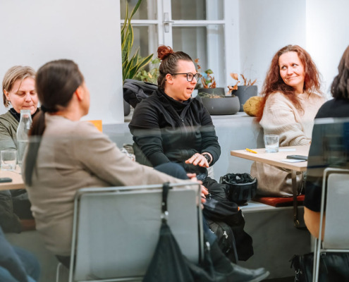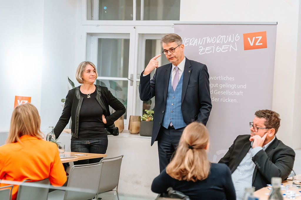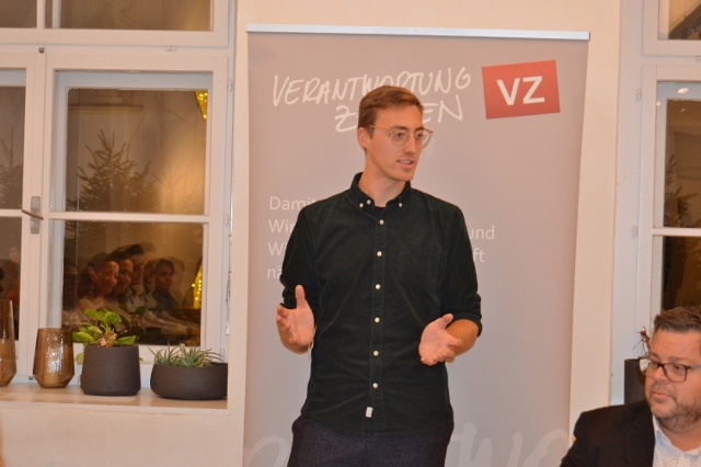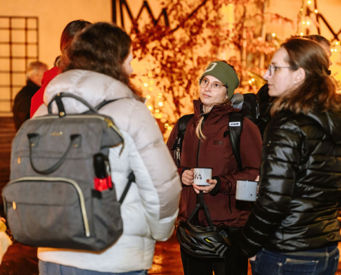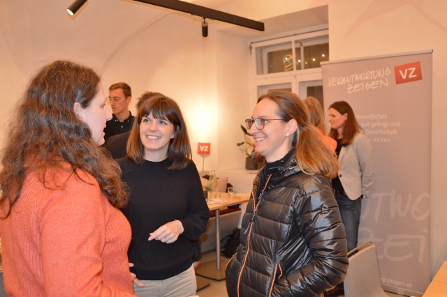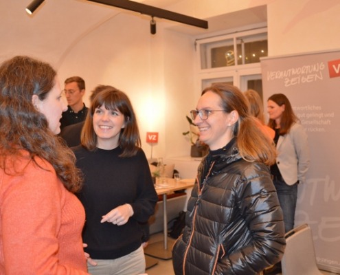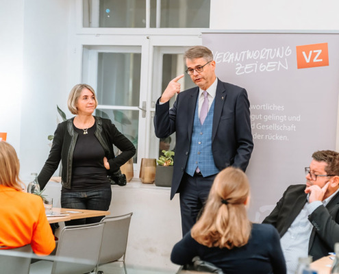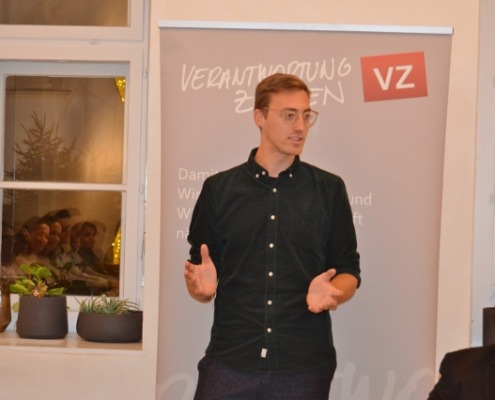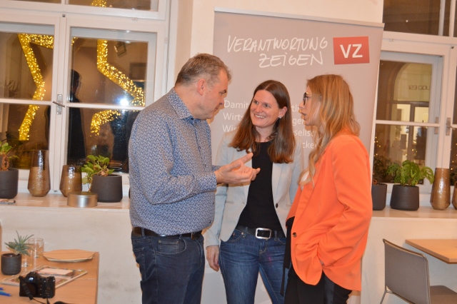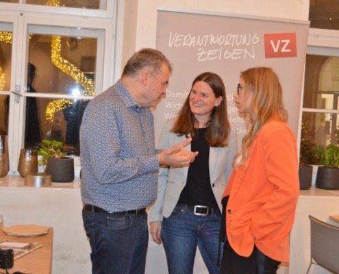 Drei Karten sind die Gäste des Advent-Openings eingeladen, zu schreiben. Einen für sich selbst: „Wofür bin ich rückblickend auf 2024 sehr dankbar – und wem?“, dann eine Karte, die später ein anderer der anwesenden Gäste ziehen dafür „Nimm diese Worte mit ins 2025“. Und nicht zuletzt Wünsche an das Netzwerk und Anregungen für ein verbindendes Motto für das kommende Jahr. Die Geschäftsführerin von Verantwortung zeigen! Iris Straßer dankte allen für die so aktive Mitwirkung und Mitgestaltung des Netzwerkjahres, Martin Straßer gab Einblick in die neue junge Gruppe im Netzwerkkreis, die VZ future minds^, von denen einige Vertreter:innen auch beim Opening dabei waren.