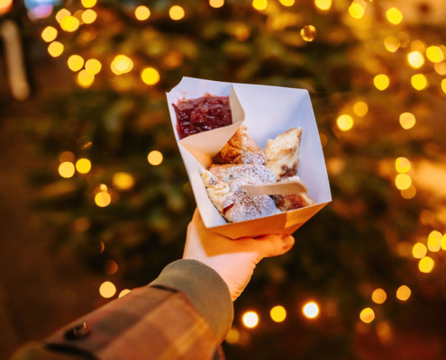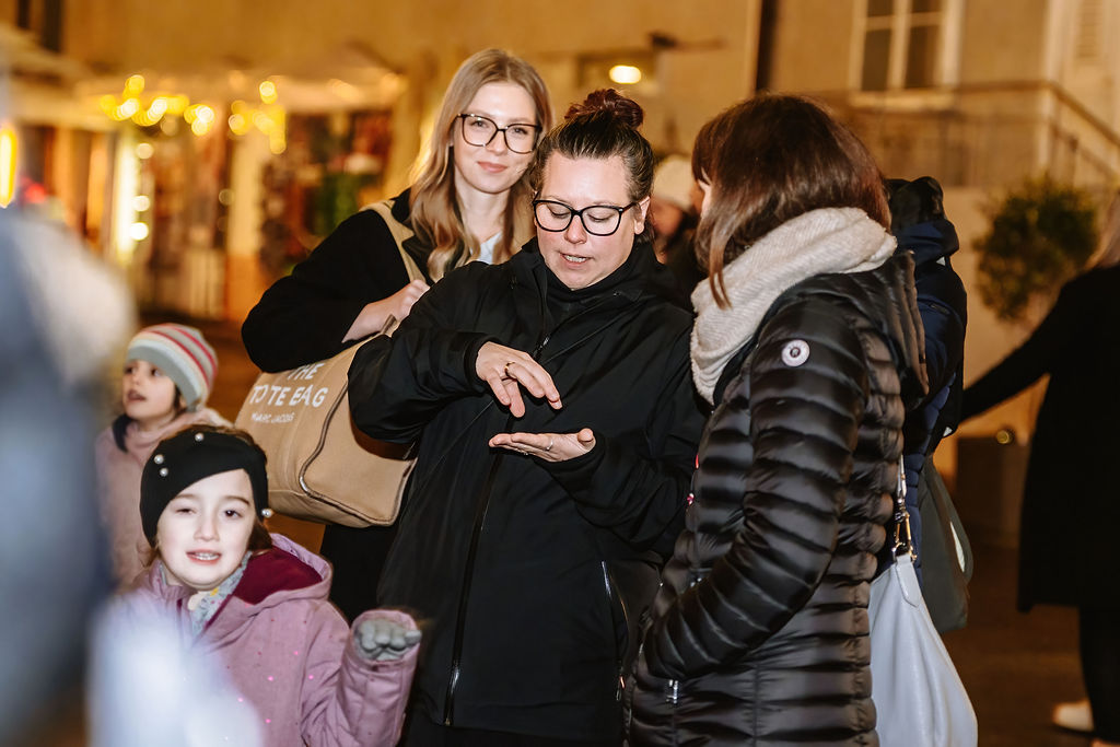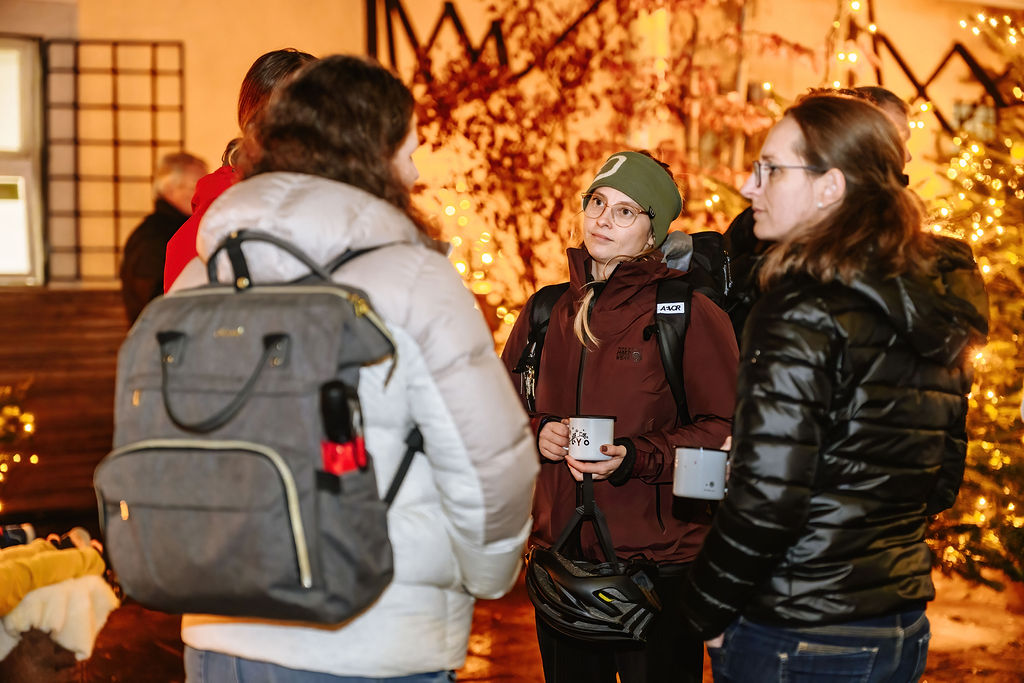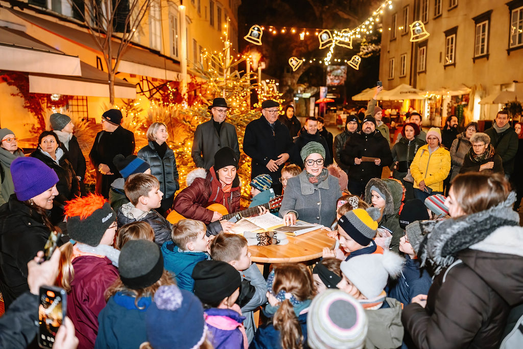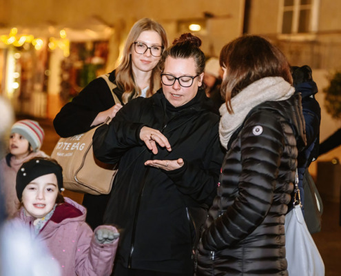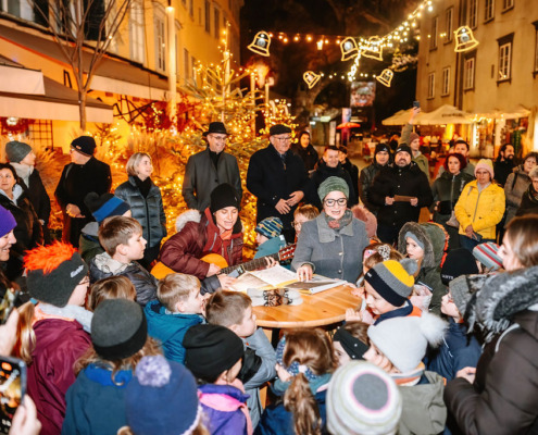 Dann ging es aus dem Lokal Klyo hinaus auf den Schlossbergplatz, wo im Beisein von Stadtpfarrprobst i.R. Christian Leibnitz und SI Wolfgang Rehner und in Kooperation mit der Diakonie de La Tour Steiermark der große Adventkranz mit den 24+4 Kerzen gesegnet wurde, untermalt von den Liedern der Kinder der Diakonie-Schule OK aus Graz. Bei Kaiserschmarren, Punsch und Tee gab es Gelegenheit zum Gespräch und auch dazu, neue Ideen für das kommenden Jahr zu konkretisieren.