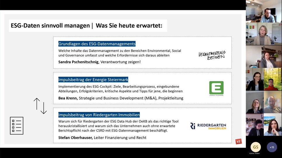 Mit den steigenden Anforderungen an Unternehmen, zu ihrer ökologischen, sozialen und Governance Performance Auskunft zu geben, steht die Frage des Managements entsprechender Kennzahlen und die Verfügbarkeit der sogenannten ESG-Informationen auf der Agenda vieler Unternehmen. Das war Grund genug für viele, sich über die Grundlagen zu informieren und sich von den Umsetzungserfahrungen der Energie Steiermark und von Riedergarten Immobilien Impulse zu holen, die möglicherweise auch softwaregestützte Umsetzung im eigenen Unternehmen rasch voranzubringen.